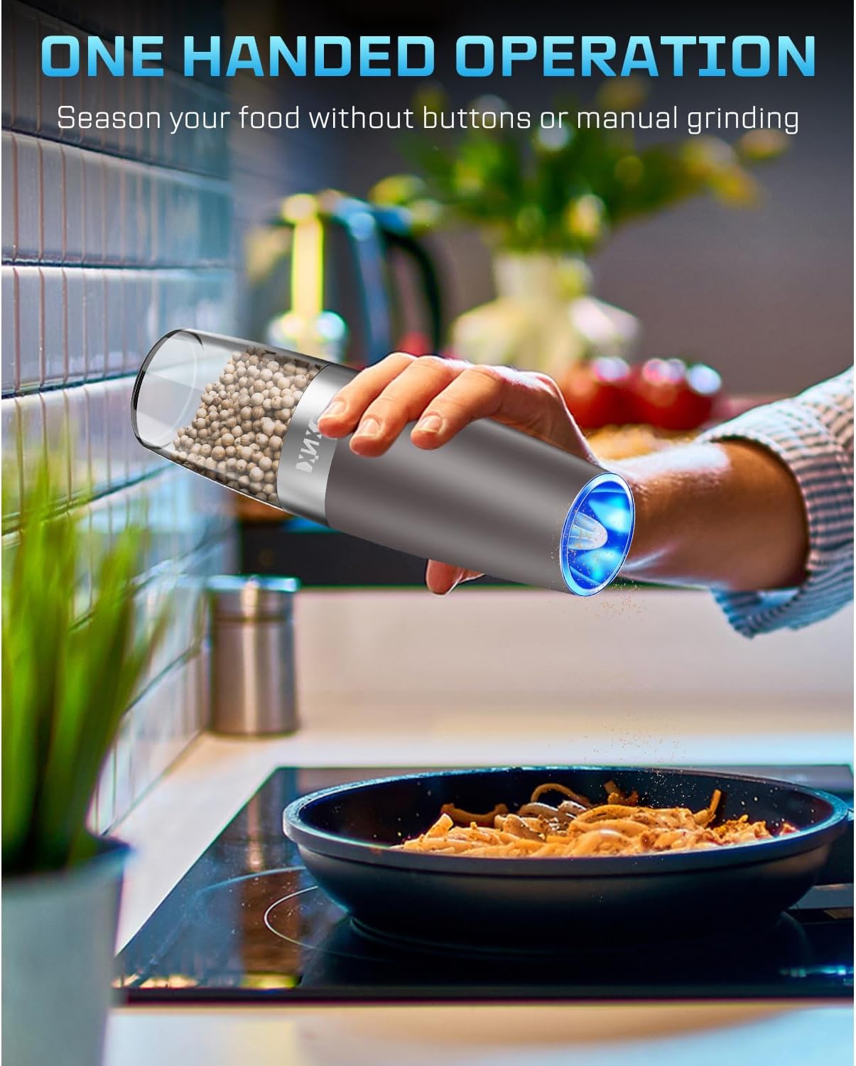 XinXu Gravity Electric Pepper and Salt Grinder Set, Adjustable Coarseness, with LED Light, One Hand Automatic Operation (Set/Brown L)