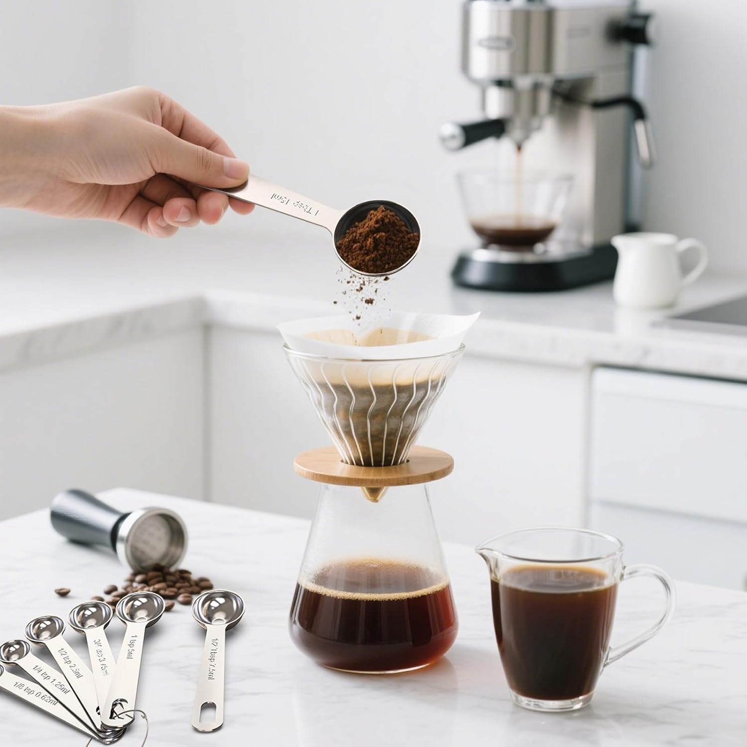 - [Multiple Sizes]: Including 7 Measuring spoons (1/8, 1/4, 1/2 , 3/4, 1 tsp, 1/2, 1 tbsp). 1 Tbsp can also be used as a coffee spoon.Meet All Your Needs On Cooking And Baking