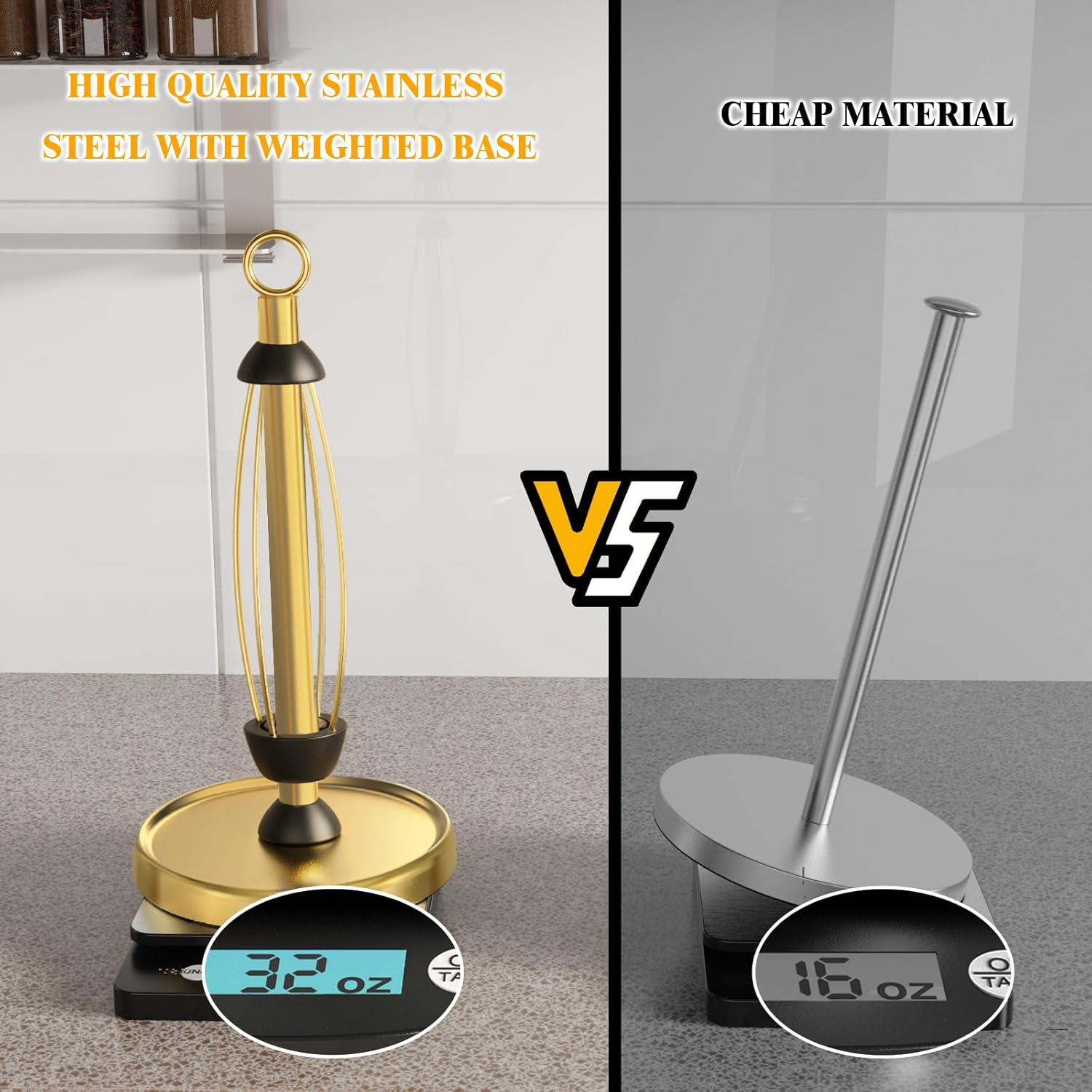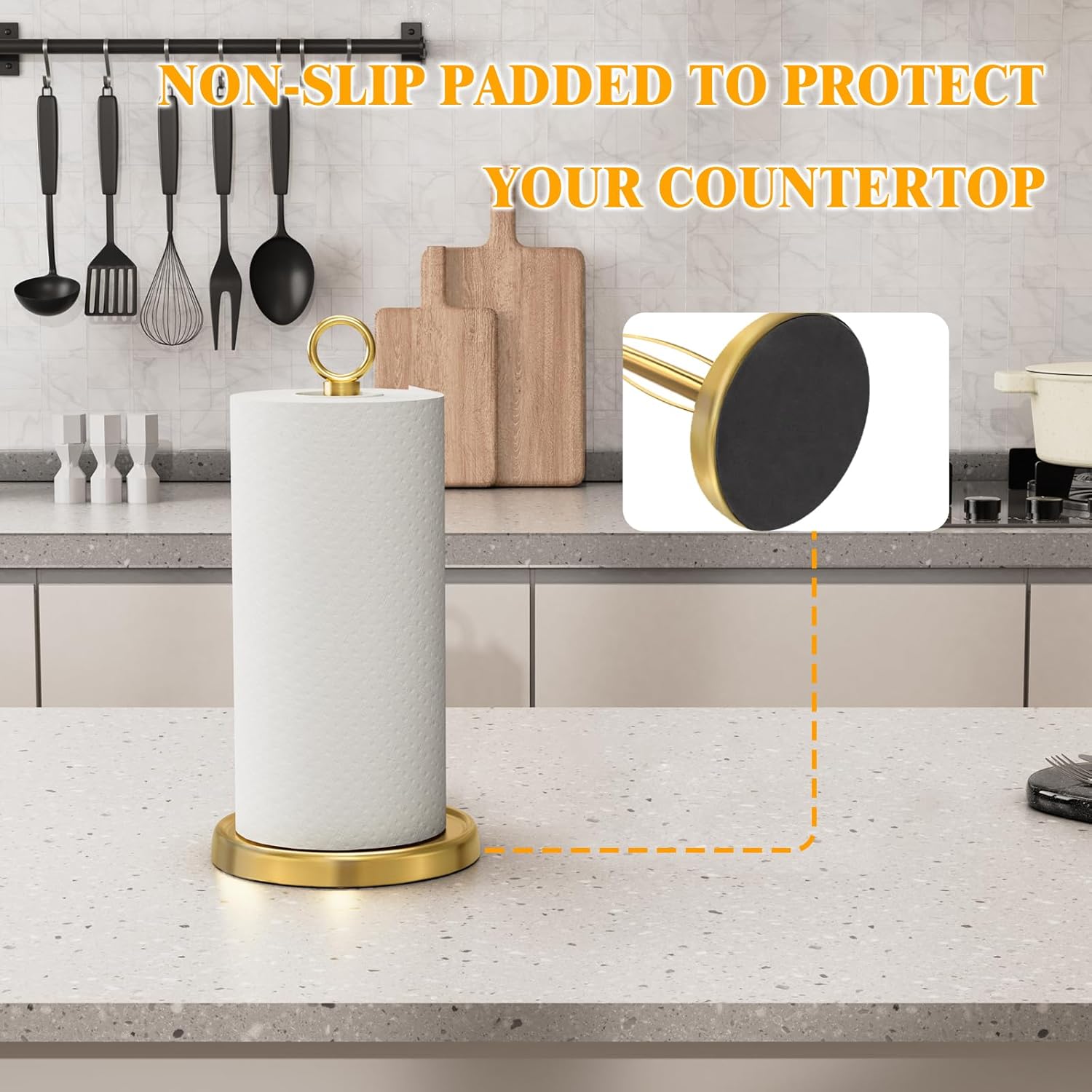 Gold Paper Towel Holder Countertop, Gold Kitchen Accessories Decor, One-Handed Tear, Stainless Steel, Weighted Base, Ring Paper Towel Holder Stand with Ratchet System for Kitchen Farmhouse Essentials
