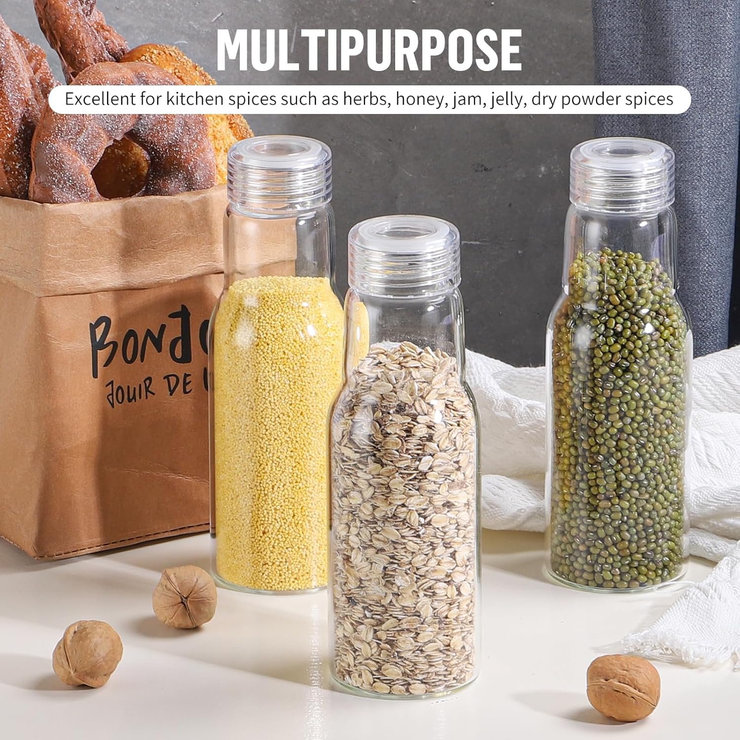 - 【Excellent Airtight and Leakproof】The glass jars with lid and silicone seal, making it double airtight and leak-proof for kitchen storage, and it does not leak when the bottle is inverted