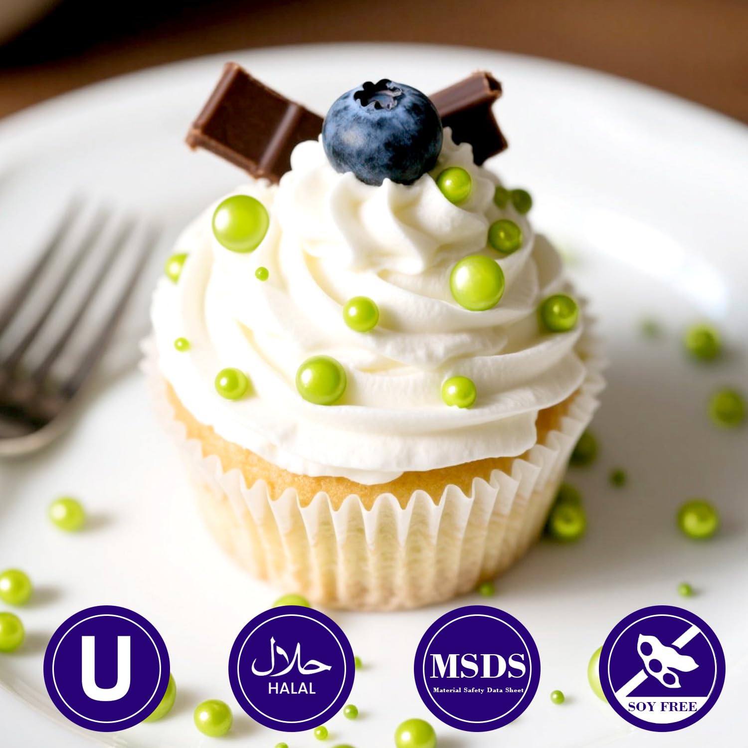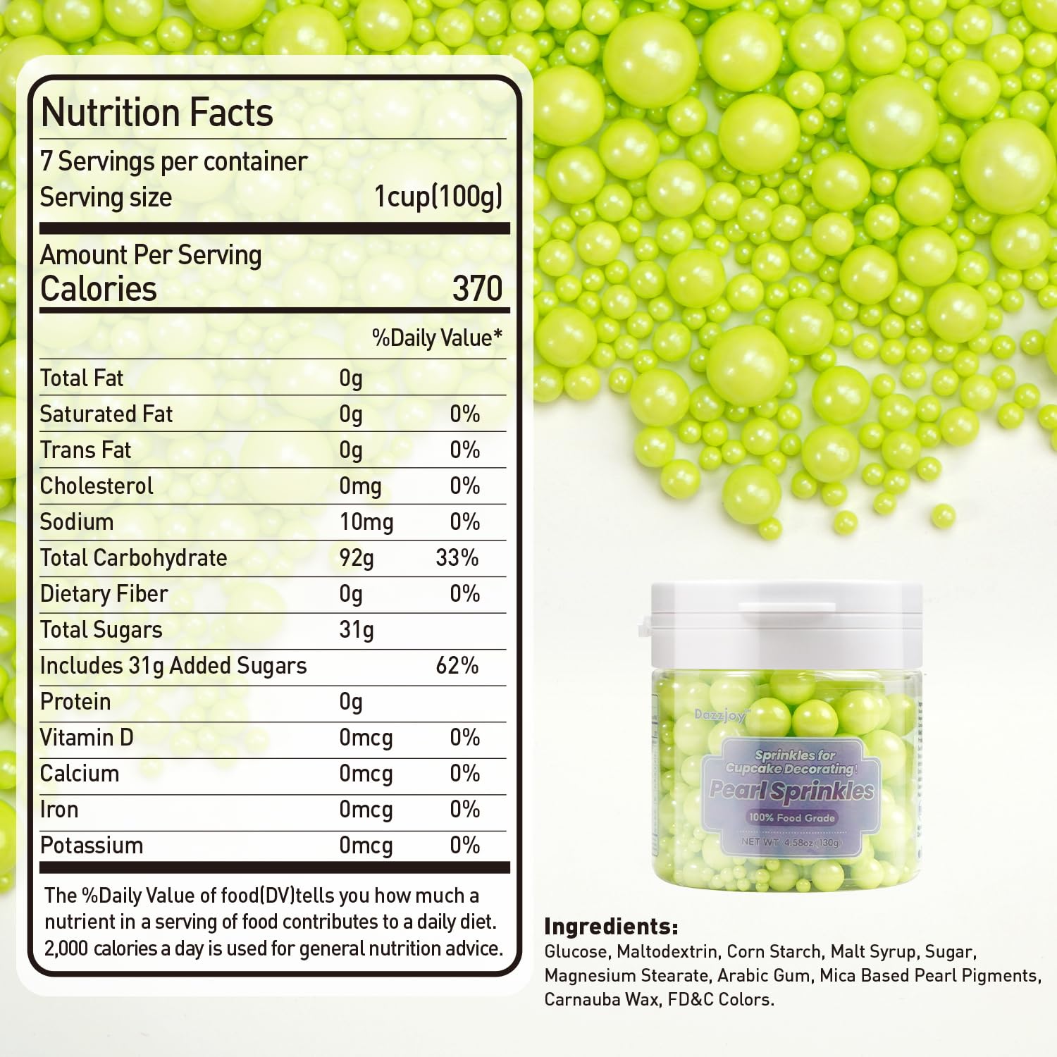 - Easter Green Pearl Sprinkles with food-grade raw materials. Preservative Free, Nut Free, Dairy Free, Chemical Free, Soy Free, Non-GMO. Produced using food-safe standards, the process does not come into contact with allergenic substances and uses Tamper-proof food label. Have Kosher and Halal Certification.