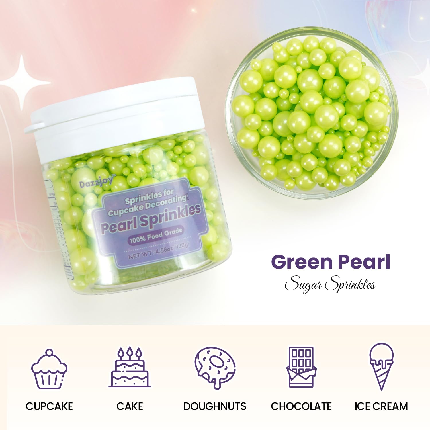 - Mix size Green Sprinkles can meet the needs of decorative production of a variety of bakery products, with a high cost-effective. Pearl Sugar Sprinkles suitable for cakes, cookies, Ice cream, Cupcakes other Foods. 1 bottle of sugar sprinkles makes 3-5 cupcakes or one 3-inch diameter cake. After baking, you can place pearl sprinkles on top of the cake as decoration.