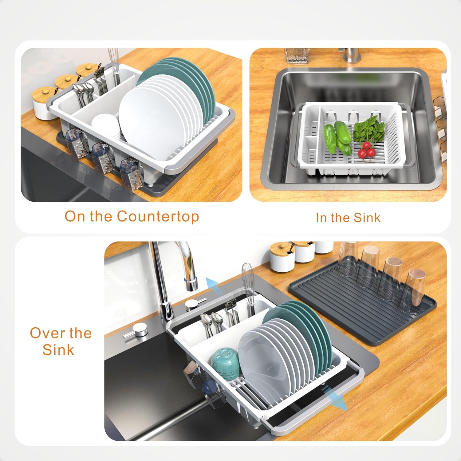 Dish drying rack expandable over the sink, in the sink and for cabinet and kitchen counter; Dish drainer rust proof, Large kitchen organizer with drainboard, two cutlery holders and 6 cup holders.