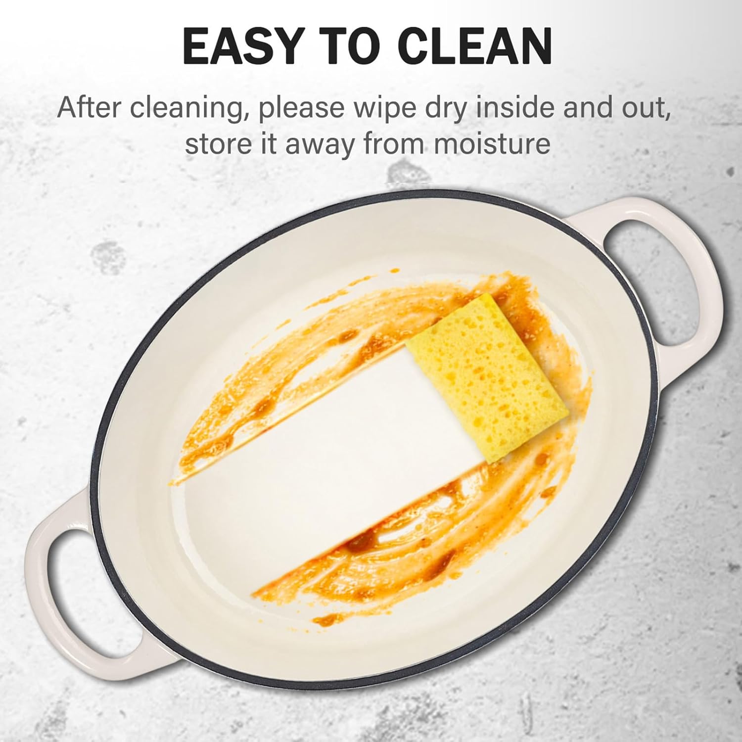 - Oval Dutch Oven Pot with Lid: Enameled cast iron oval dutch oven casserole dish pot with lid is made of cast iron and covered with heavy-duty enamel to avoid chipping. The design of white non-stick enamel interior is engineered to ward off dulling and staining. This oval dutch oven does not need to be seasoned in advance, so it is very suitable for healthy cooking without safety worries