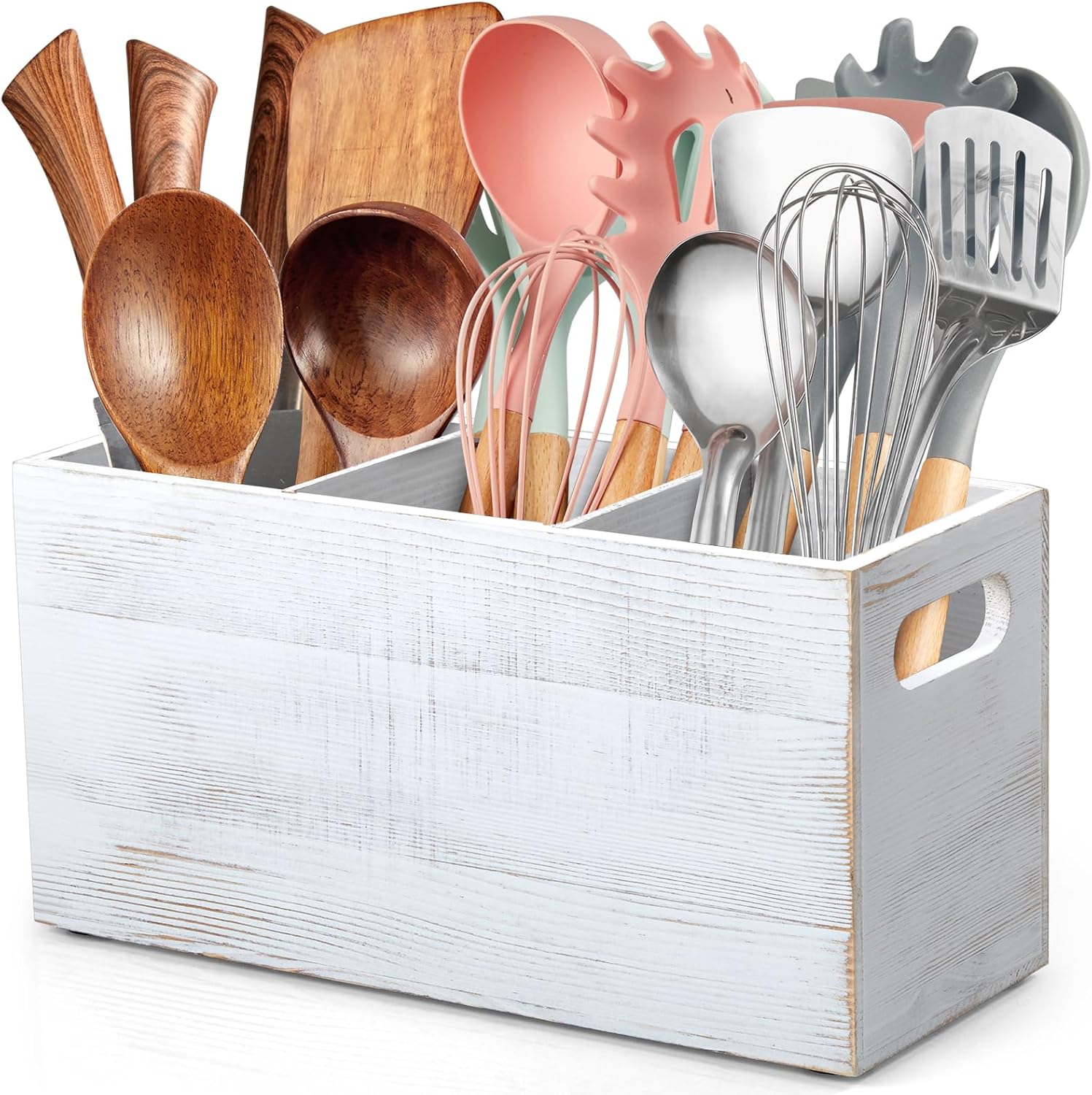 ALELION Rustic White Utensil Holder with Removable Divider - 3 Compartment Wooden Utensil Caddy Organizer for Kitchen Counter - Cooking Utensil Crock for Countertop