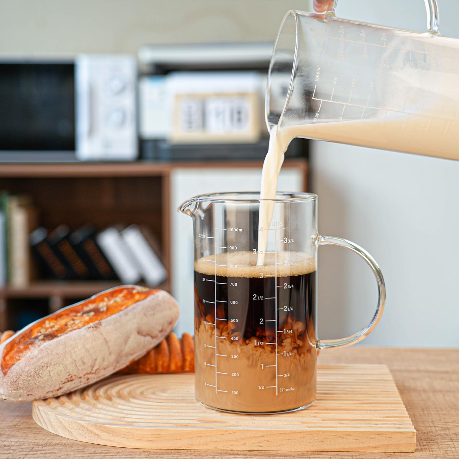 BCnmviku Glass Measuring Cup, Insulated handle, V-Shaped Spout, High Borosilicate Glass Measuring Cup 1000ML、 /1 Liter, 4 Cup for Kitchen or Restaurant, Easy To Read (1000ml-1pcs)