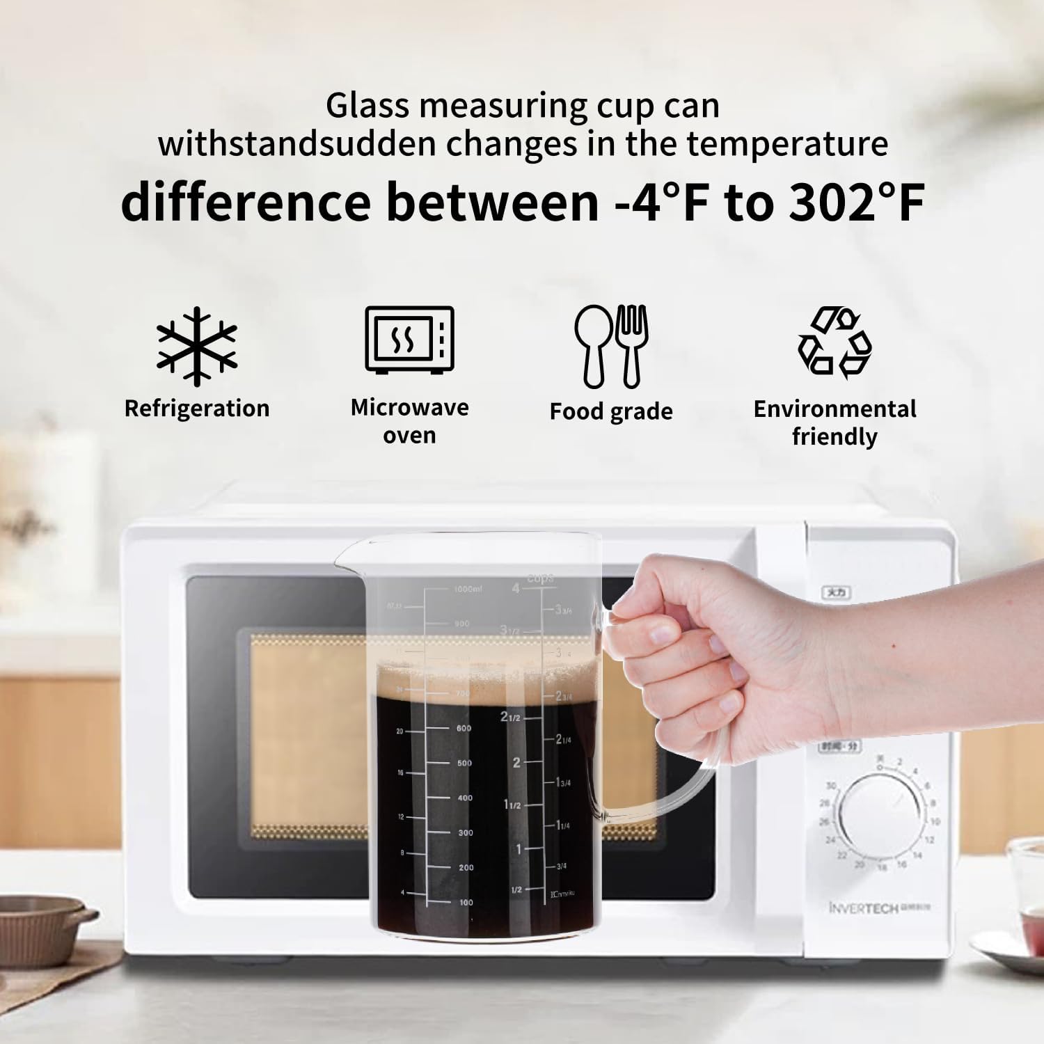 - 1000ML [4 CUP]. Made from high borosilicate glass. Apply to Gas stove, Microwave, Electric Ceramic stove, Oven and Refrigerator. Not safe in electromagnetic oven. (Please note: dishwasher safe, yet best to wash by hand since, over time, dishwashers can affect measurement markers.) 3 different measurement scales, including Cup, ML, OZ.