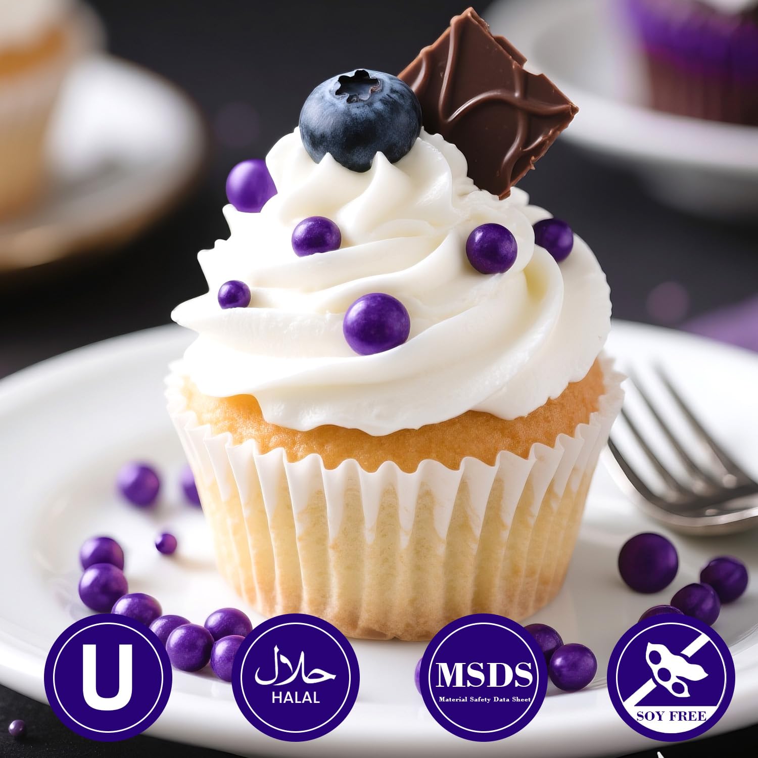 - Edible Purple Sprinkles with food-grade raw materials. Preservative Free, Nut Free, Dairy Free, Chemical Free, Soy Free, Non-GMO. Produced using food-safe standards, the process does not come into contact with allergenic substances and uses Tamper-proof food label. Have Kosher and Halal Certification.