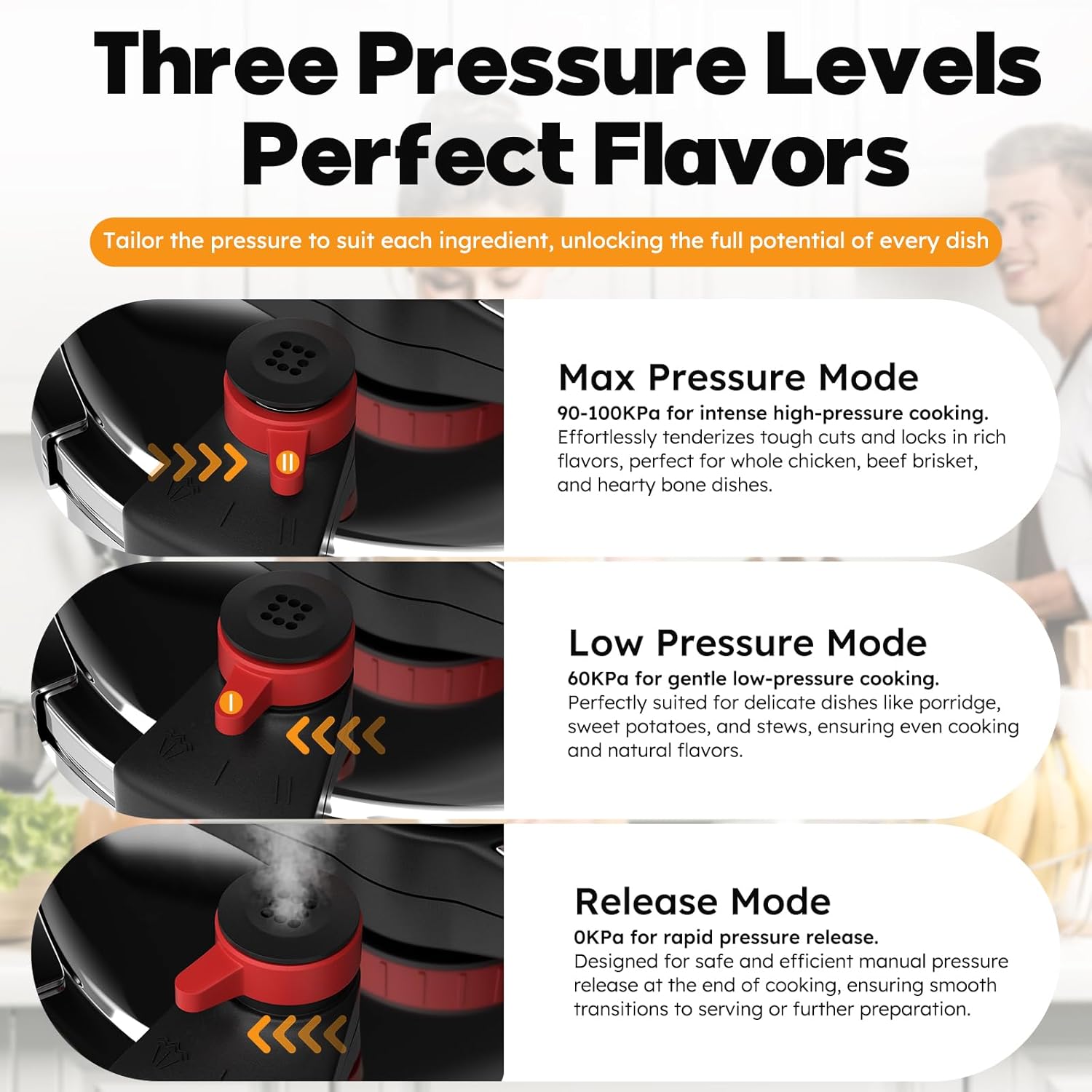 - [ 3-Stage Pressure Control ] The adjustable pressure valve offers three settings (0PSI, 10PSI, 15PSI) for precise cooking control. The timer ensures accurate time management, giving you complete control for consistently perfect results