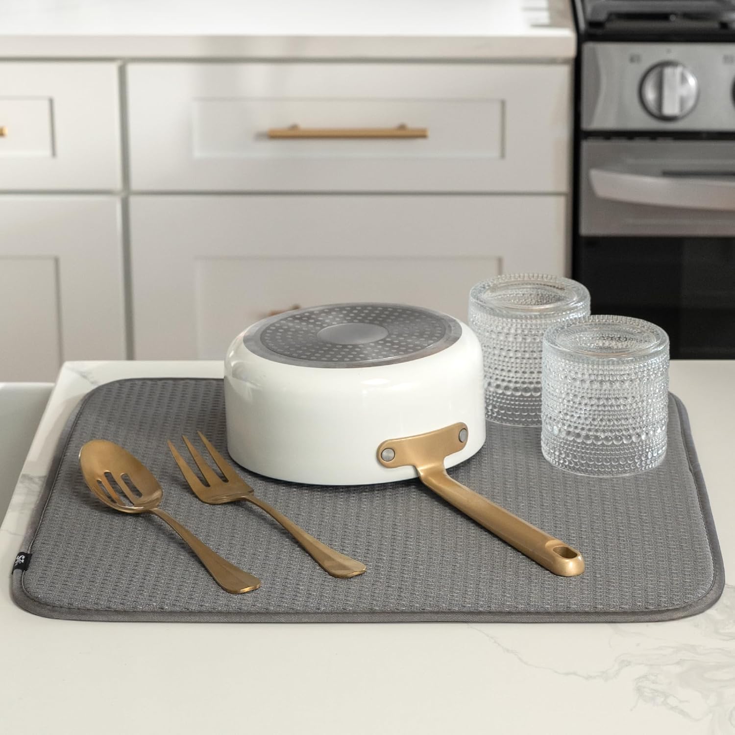 - Dish drying mat for kitchen counter protects surfaces from scratches and scuffs when placed under kitchen gadgets; multipurpose drying pads can be used as an appliance slider for a mixer or blender