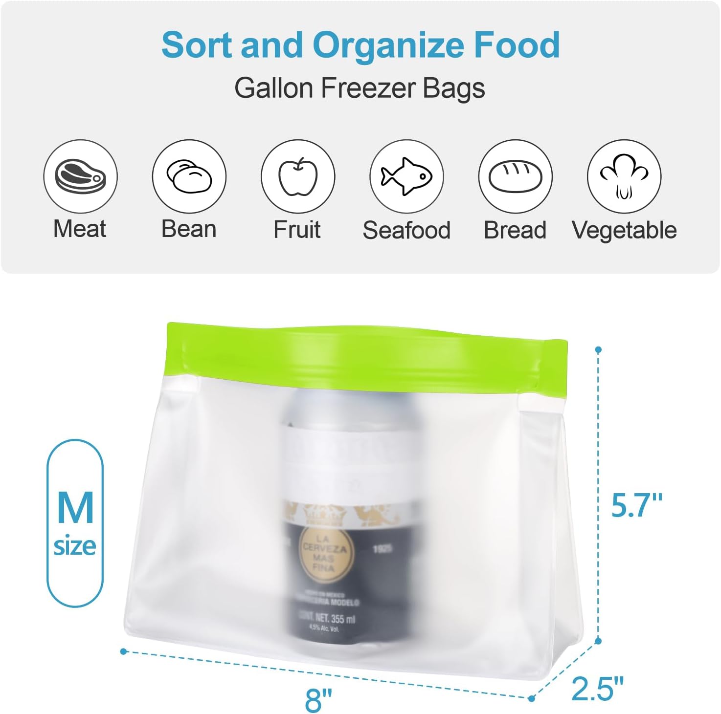 - [Large Capacity Freezer Bags] The size of reusable storage bags is 8.1 x 2.5 x 5.7 inches, 10 pack sandwich bags work well for smaller items like fruits, veggies, and sandwiches. When needed, simply access the bag you want without having to thaw and re-cut, preserving the food's quality