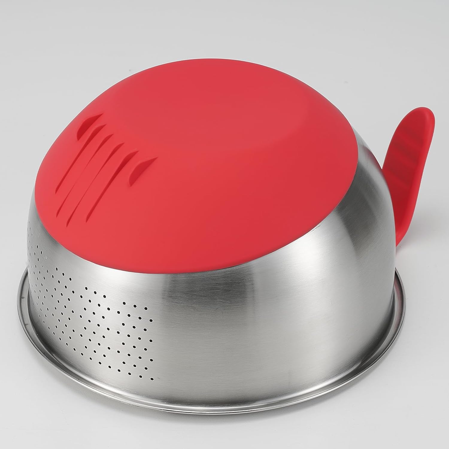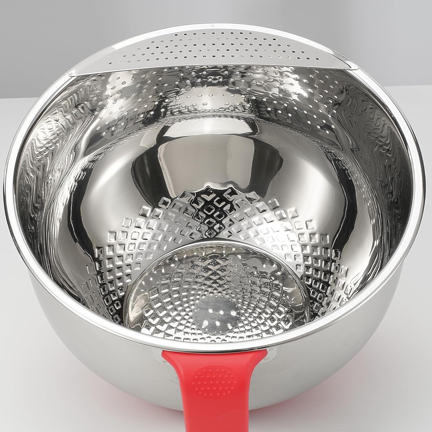 Rice Strainer Washing Bowl Quinoa Washer whit Handle Stainless Steel Colander Versatile Side Drainers for Cleaning Rinsing Fruits, Vegetables, and Beans - Tilting Non-slip Silicone Bottom, Red