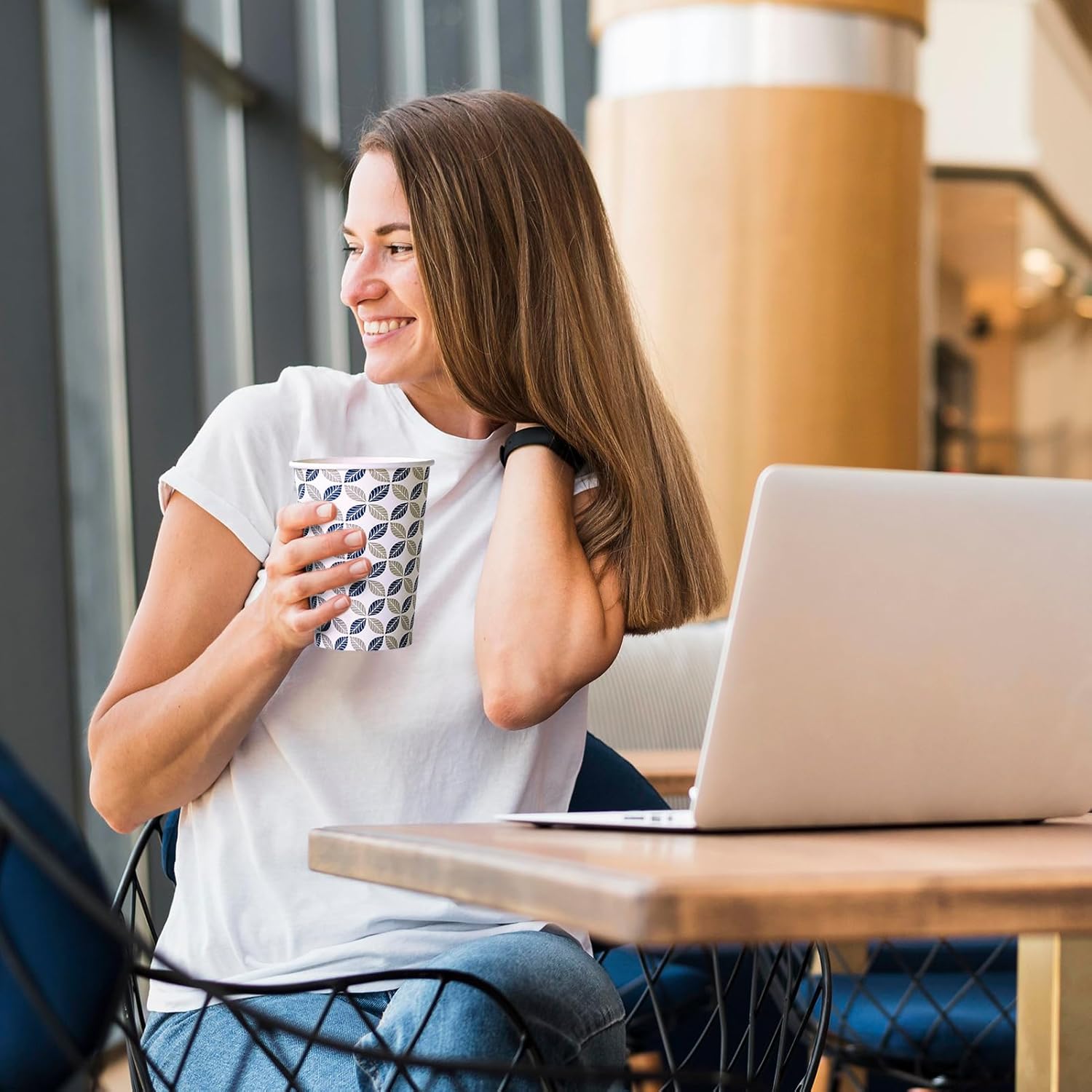 - ăStylish DesignăThese coffee cups feature a unique blue and grey leaf print design that adds a touch of elegance to any setting. The fashion colors and simple patterns make them perfect for daily use and businesses