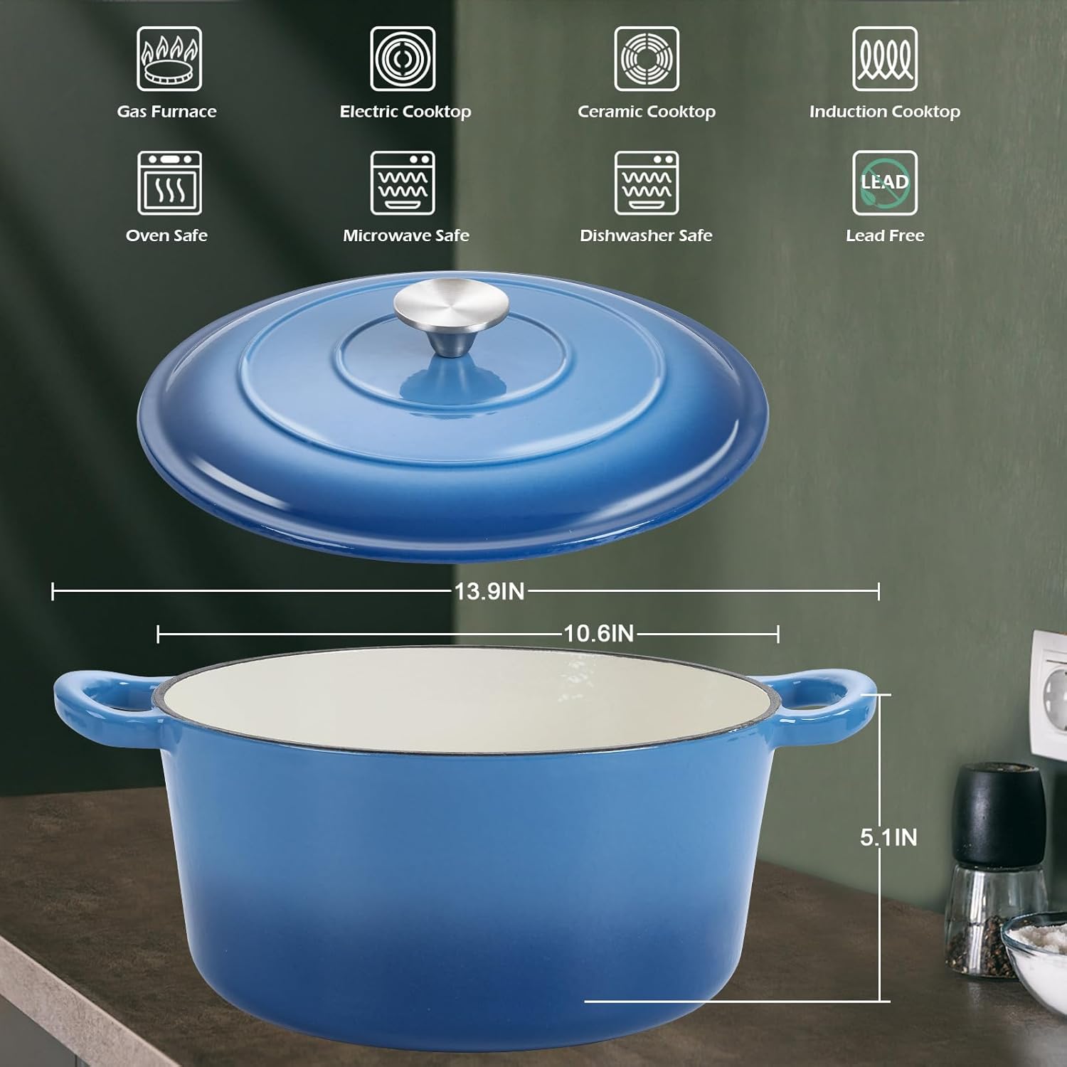 6 Quart Round Dutch Oven with Lid, Leonyo 6QT Enameled Cast Iron Dutch Oven for Sourdough Bread Baking, Heavy Duty Cookware for Braising, Stews, Roasting, Blue