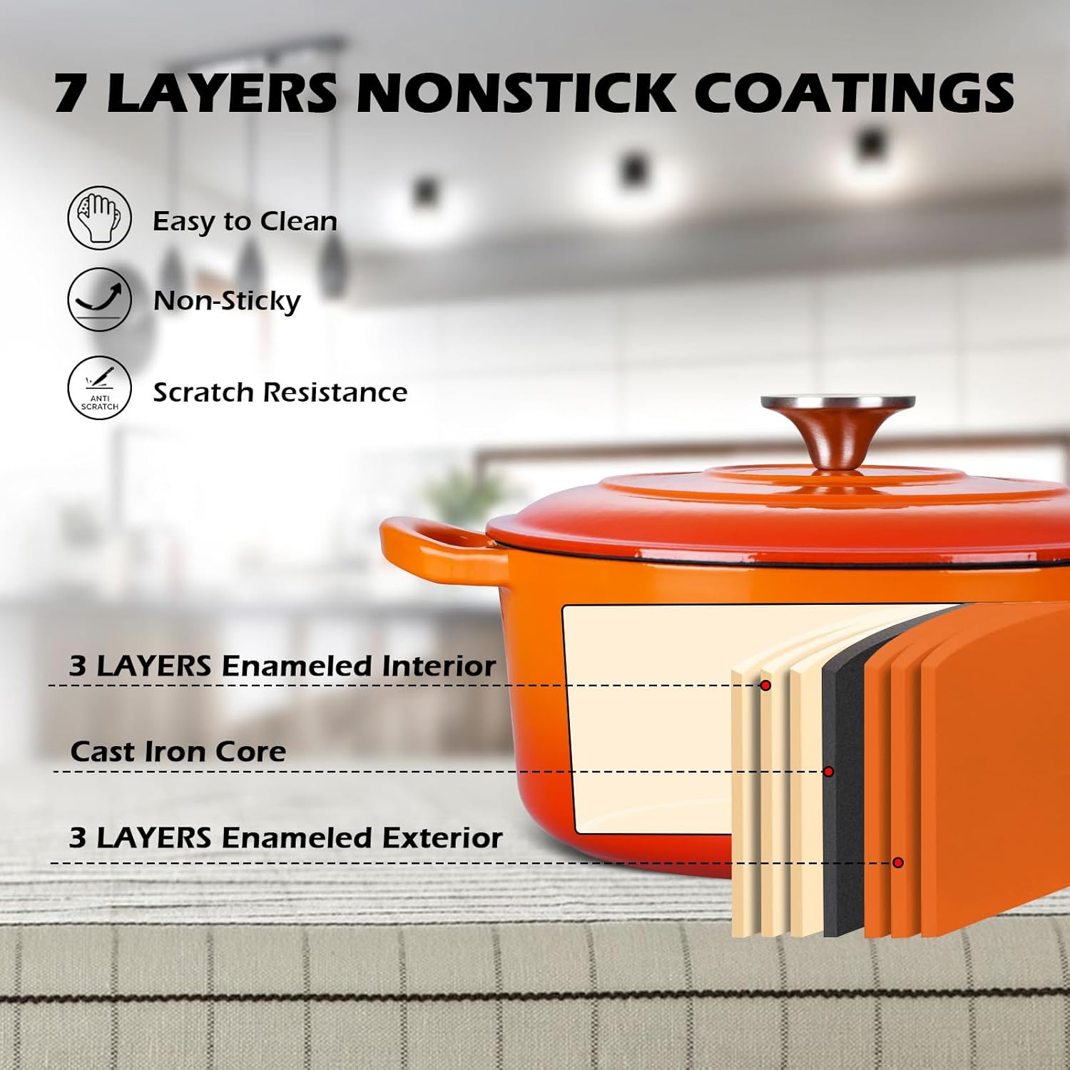 - Heavy Duty Material, Dutch oven pot with lid is made of 6 layers enamel and cast iron core layer, 4mm thickness pot wall with one-piece molding design enhance the strong construction without cracks or chips, high gloss enamel surface with no chemicals, form a layer of smooth coating to keep away from rusting and reduce food sticking
