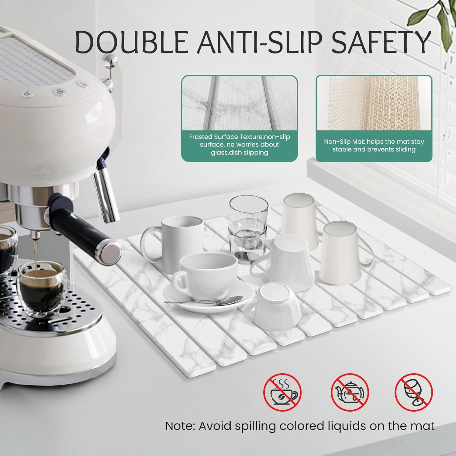 Stone Dish Drying Mat Collapsible Diatomaceous Earth Absorbent Mat Quick Dish Drying Pad Dish Rack Pad Match Any Counterto Multiple Usage for Kitchen,Bathroom (White Marble Pattern, 24"L x 16"W)