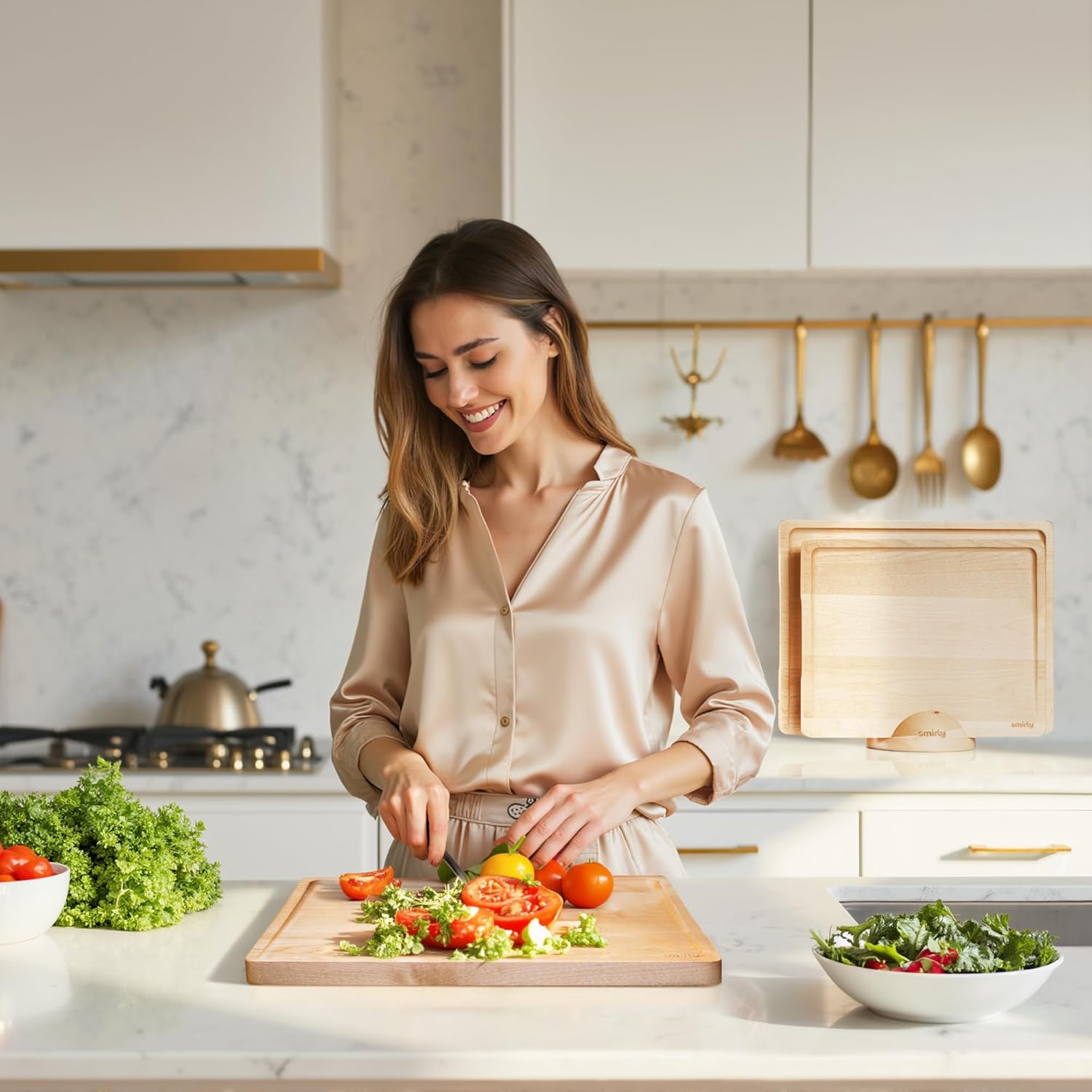 SMIRLY Wood Cutting Boards for Kitchen Wooden Chopping Board Set Reversible with Deep Juice Grooves Grip Handles, Large Charcuterie Tray for Home Kitchen, Natural Birch, 3Pcs with Holder