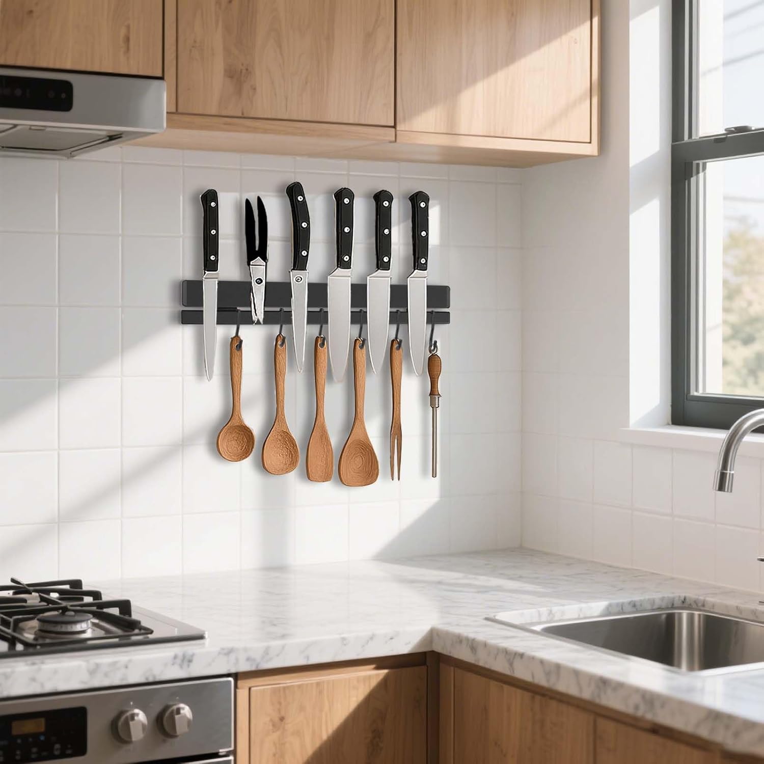 - 【Premium 304 Stainless Steel & Secure Hook Design】This magnetic knife holder no drill is crafted from high-quality rust-proof 304 stainless steel for damp kitchens. Our patented double-bar adhesive magnetic knife strip for wall structure with narrow-gap hook slots prevents accidental falls, safely holding non-magnetic items