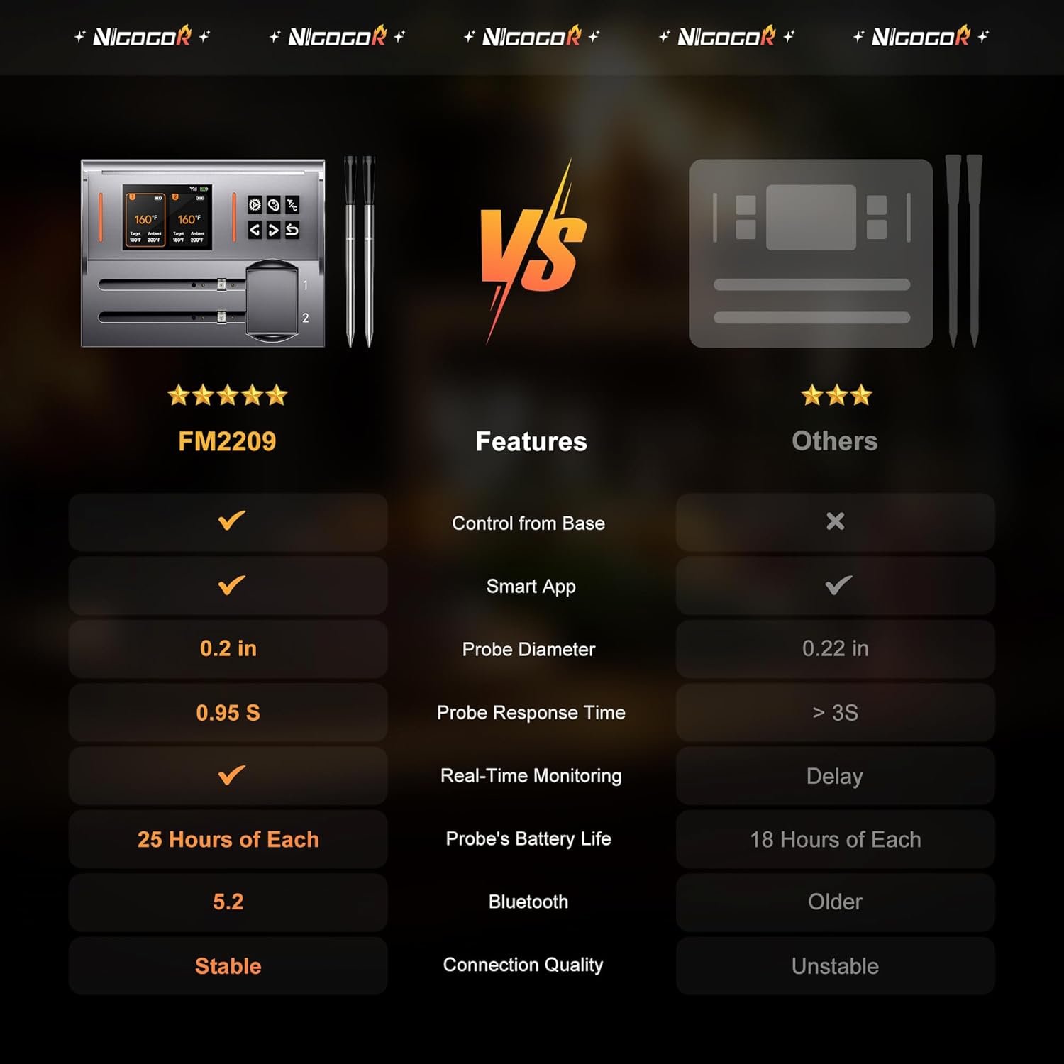 - Dual-Temperature Monitoring with Ceramic Probe: 2 ultra-thin wireless meat probe sensors track internal meat temp (212°F) and ambient Grill/Smoker temp (572°F) simultaneously. Heat-resistant ceramic handle ensures faster heat transfer & meat integrity. IPX7 waterproof probes and dishwasher safe, effortless cleaning.