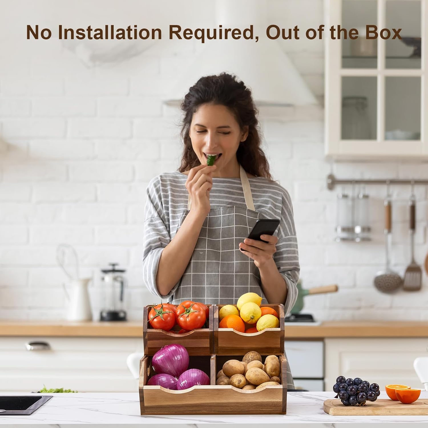 Acacia Wood Pantry Storage Bins, Stackable Storage Baskets Potato and Onion Storage Bins, Pantry Organizer Wooden Baskets Organization and Storage, Set 3 Pieces