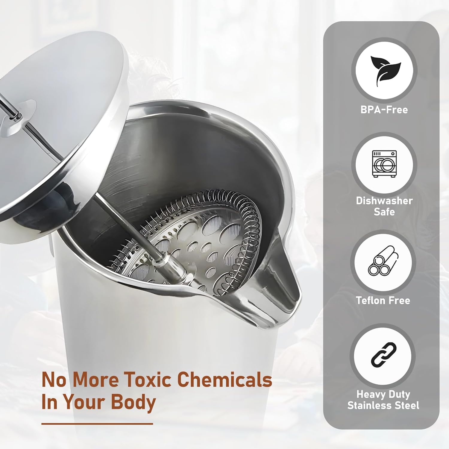 • Premium 304 Stainless Steel Inserts Construction:Crafted from high-quality 304 stainless steel, this French press is built to last. Unlike glass or plastic models, it resists rust, corrosion, and breakage, ensuring long-term durability. Perfect for daily use at home, in the office, or even during outdoor adventures like camping.