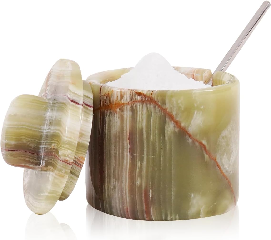Marble Salt Cellar with Lid and Spoon 4 Inch Handmade Green Small Seasoning Containers - Decorative Spice Jars, Sugar Bowl & Flaky Salt Dish for Kitchen Countertop Storage