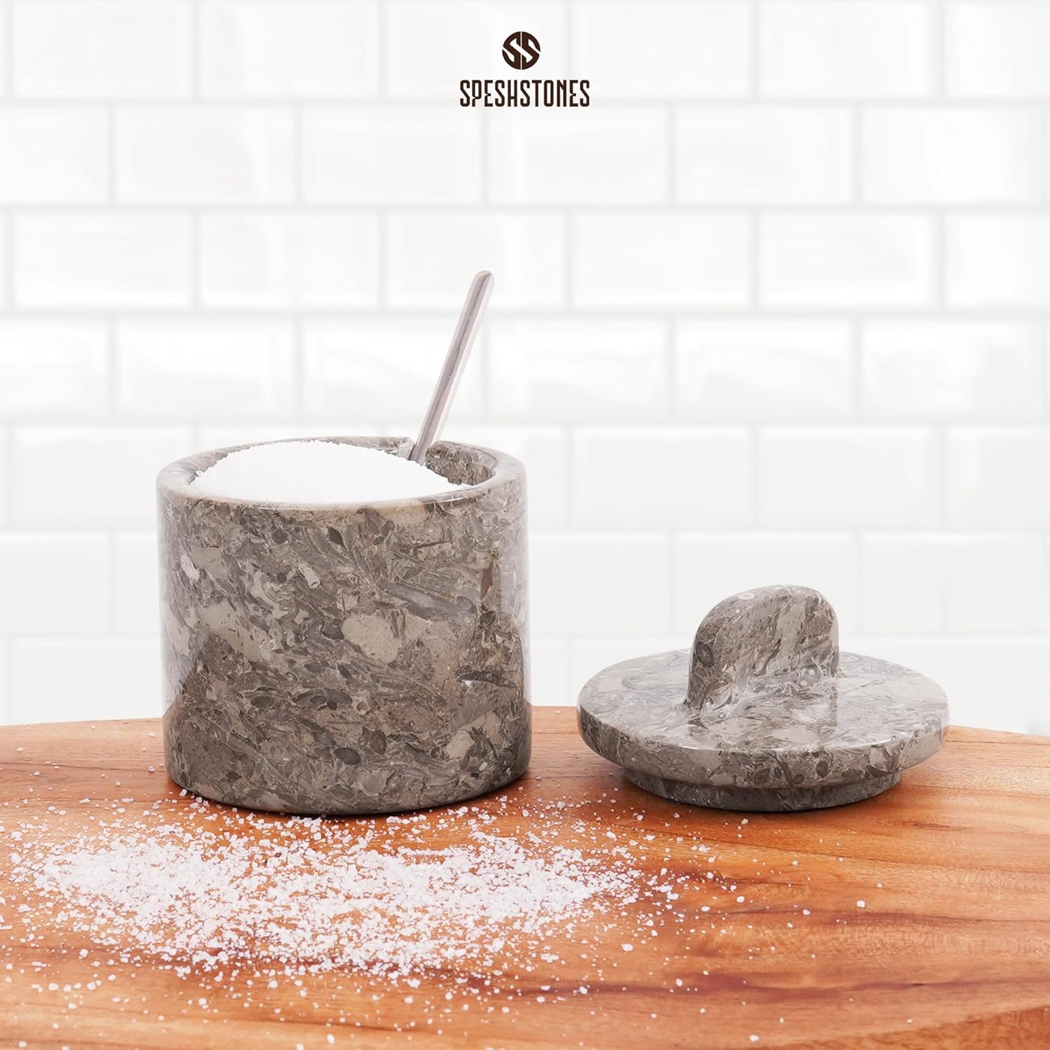 - WHAT IS INCLUDED - 1 x Marble Salt Cellar with Lid and Spoon. Comes along with SPESHSTONES Branded Secure and Fragile Packaging.