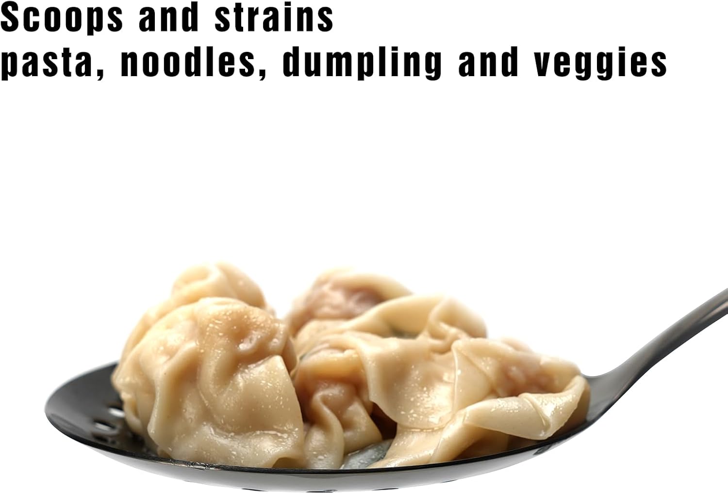 - Quick Straining: Our oval hole design ensures maximum draining speed and without slipping. This skimmer spoon can be used to scoop out vegetables, poached eggs, potatoes, noodles, dumplings, wonton etc.
