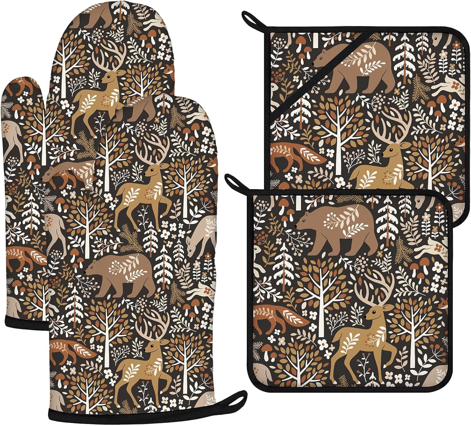 Bear Deer Oven Mitts and Pot Holders Sets 4Pcs,Extra Long Oven Gloves Potholder for Kitchen Cooking Baking BBQ 100% Cotton Heat Resistant
