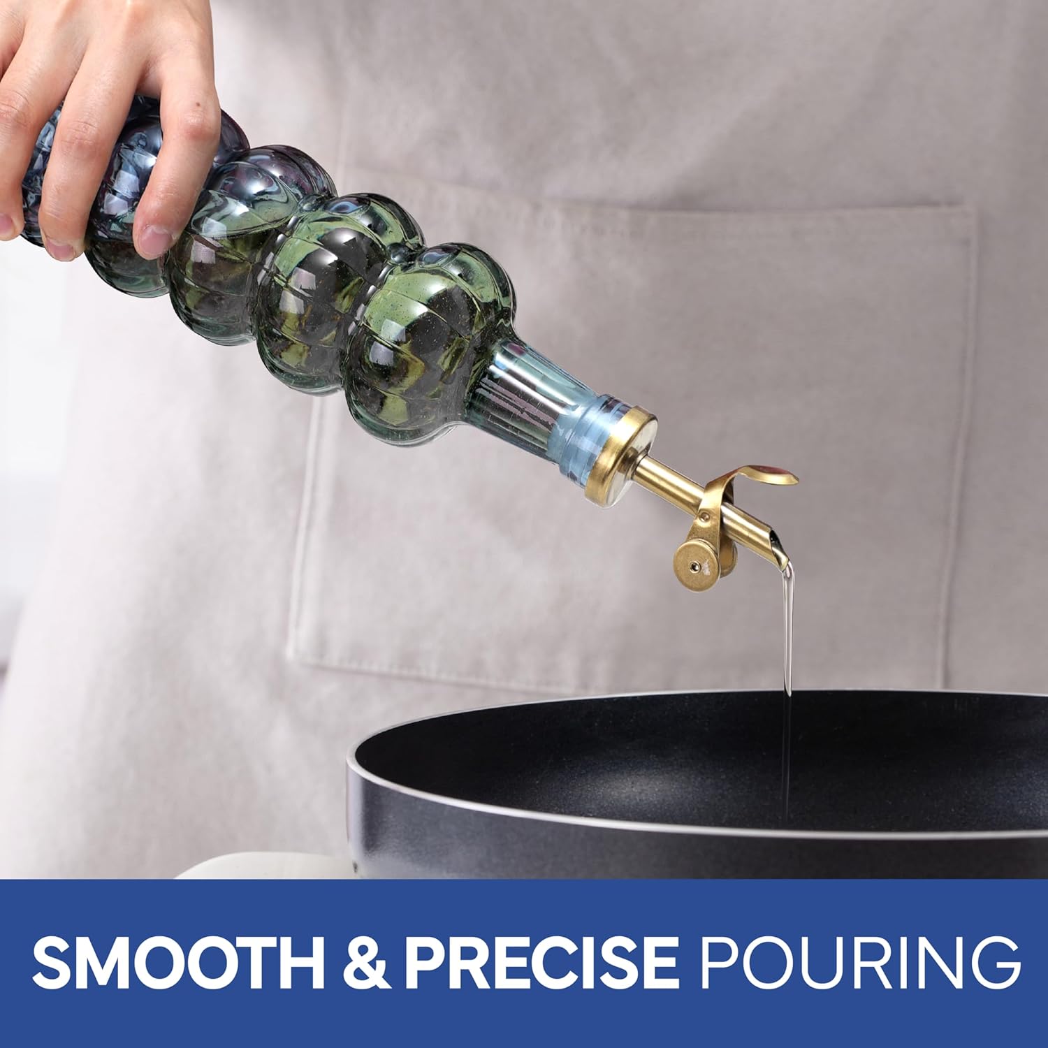 - Beautiful and Functional - Our colored glass oil dispensing bottles, with elegeant colors, gold tops and gold wire rack, will elevate your kitchen. Don't use just any oil bottle, upgrade the way you cook. That's our mission.
