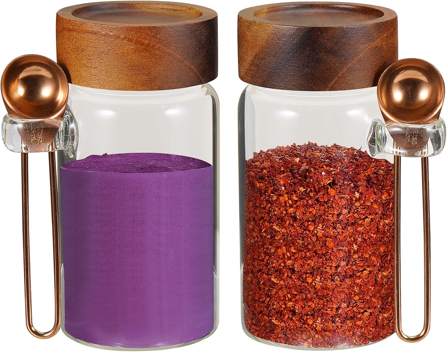 Glass Coffee Jars Spice Jar Round Storage Canister with Wooden Lid Clear Glass Food Jar for Pantry Sugar Tea Coffee Bean Spice Nuts Cookies Bath Salts (2×250ml(8.4oz) with scoop)