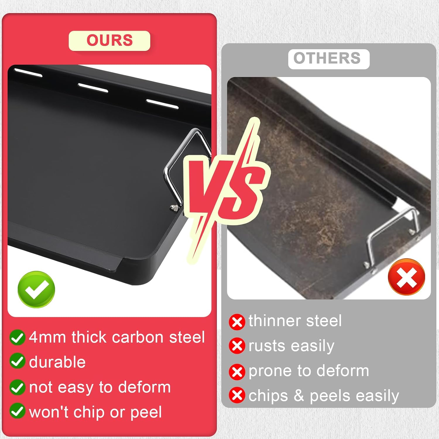 - Built to Last: Concerned about durability? Crafted from heavy-duty carbon steel, our griddle is not only non-stick but also designed to withstand the rigors of frequent use.Unlike flimsy alternatives, this robust griddle ensures you can create memorable meals without worrying about wear and tear. Invest in a solution that stands the test of time!