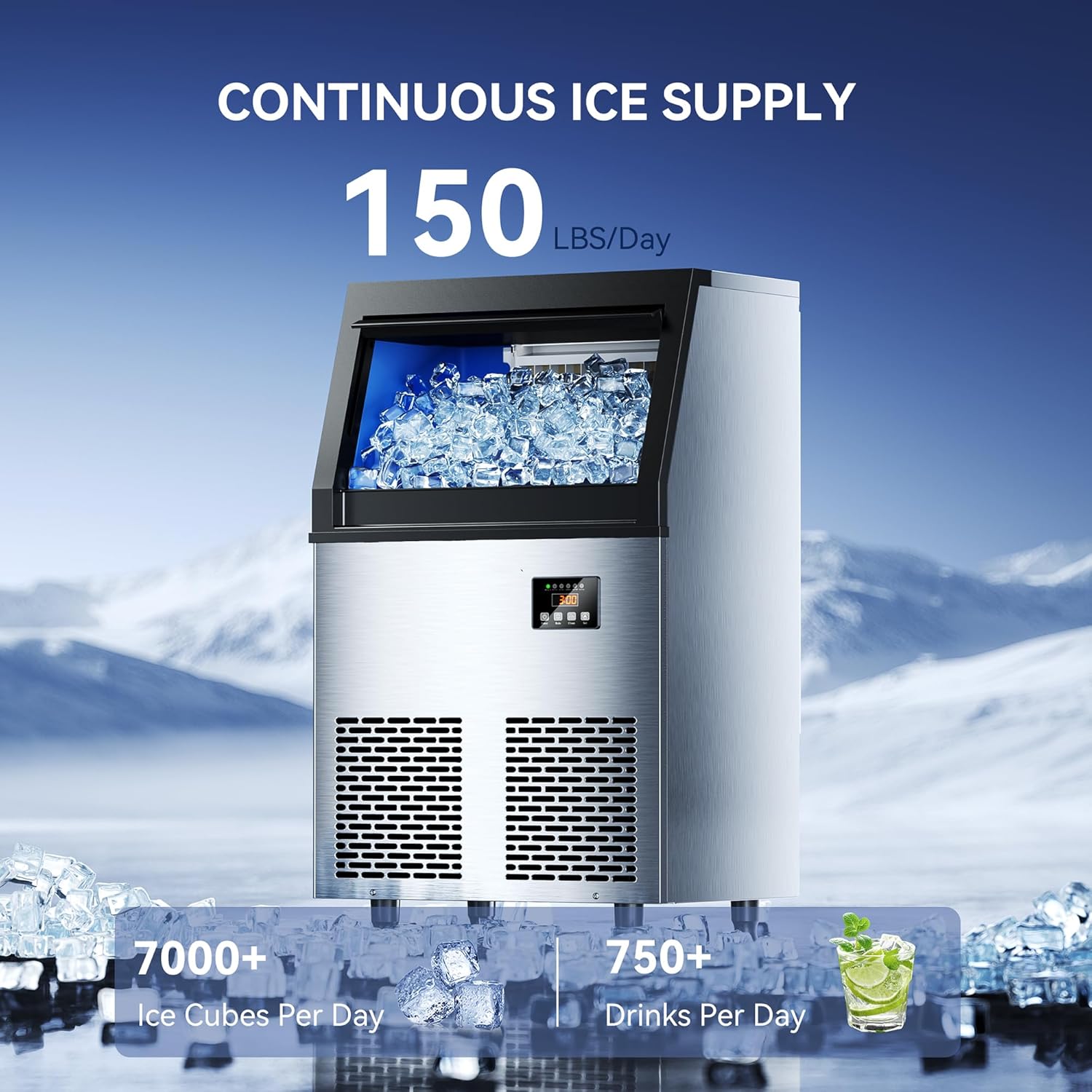 150 lbs/24H Commercial Ice Maker Machine,45 Cubes/6mins, 35 lbs Ice Storage Capacity, Under Counter Ice Maker Self Cleaning, Stainless Steel Freestanding Ice Maker for Home Bar Restaurant