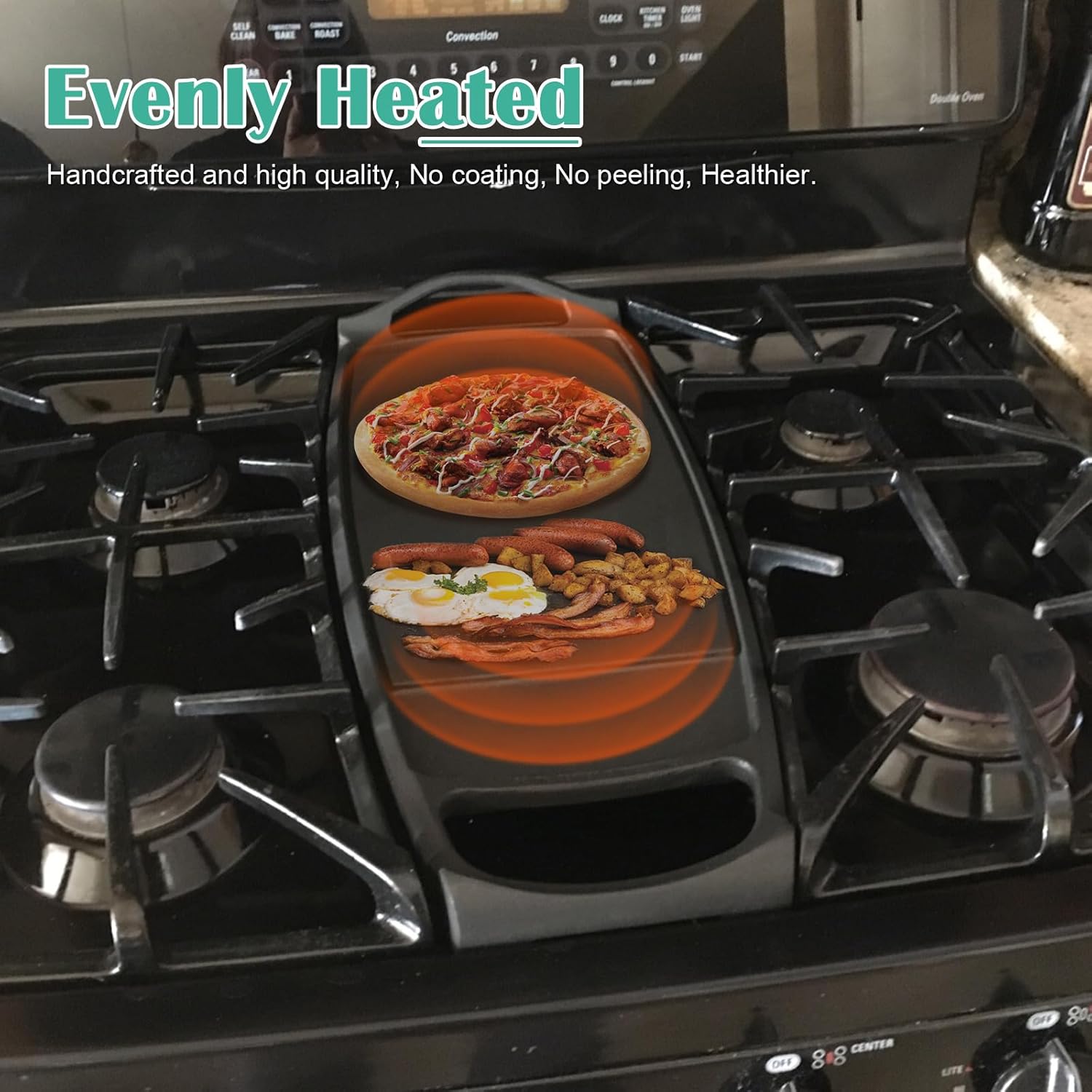 - ► Easy To Clean - Our flat top griddle replacement is made of cast iron, so cleaning this griddle plate requires special attention to avoid damaging the seasoned surface. After cooking, let the griddle cool down before cleaning. Next, wipe away any leftover food particles. You can use a paper towel or a plastic food scraper for this. Avoid using soap or detergent as it can strip away the seasoning. Rinse the griddle with hot water and dry it thoroughly. If necessary, apply a thin layer of cooking oil to the surface to prevent rusting.