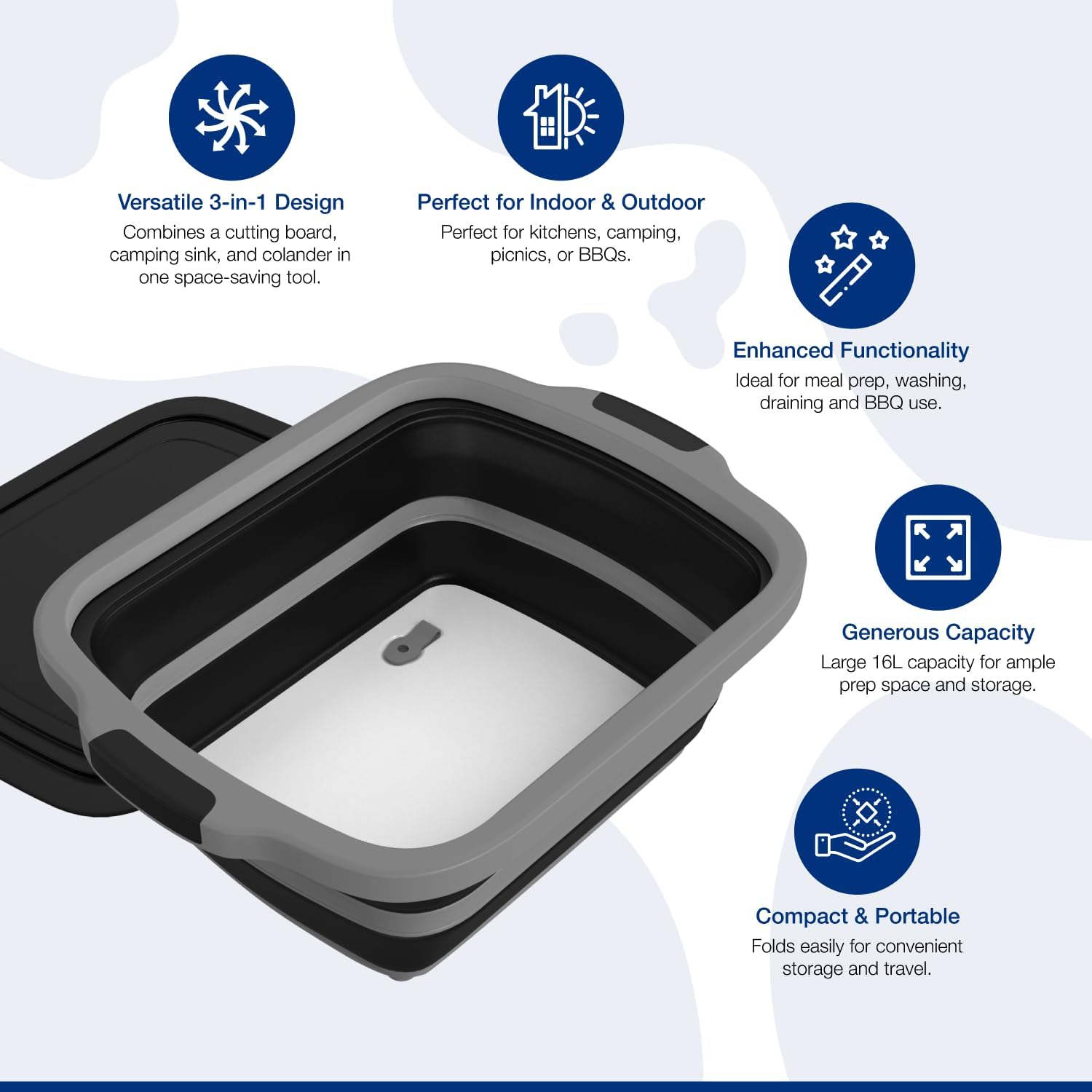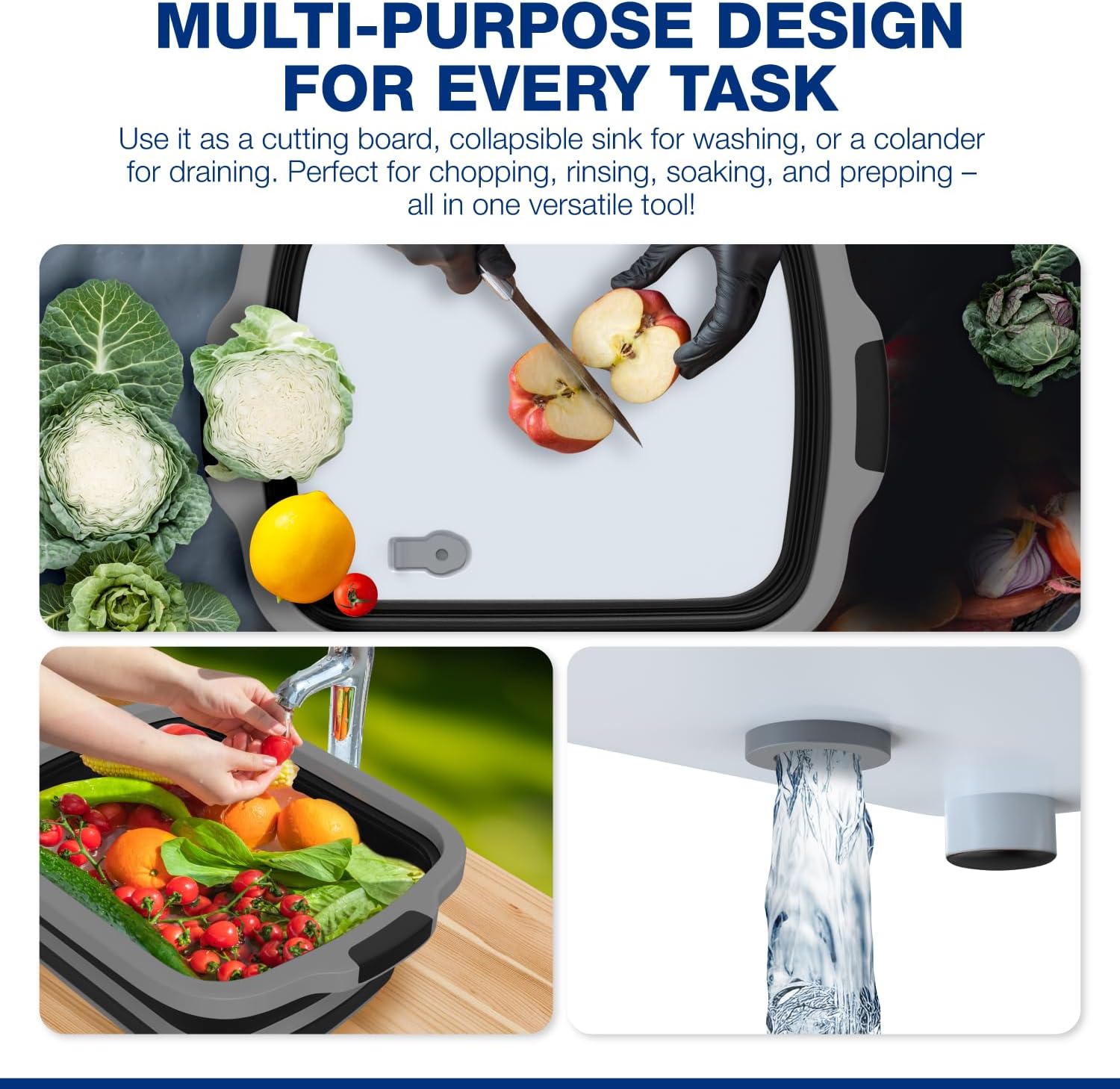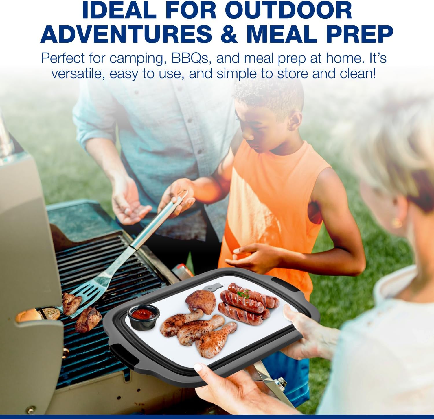 • BBQ Marinate, Drain & Prep – Made from food-safe materials, this tub lets you marinate meats mess-free, drain excess liquids with the built-in strainer, and prep food on the sturdy cutting board. The collapsible design saves space, and it's easy to carry for effortless grilling.