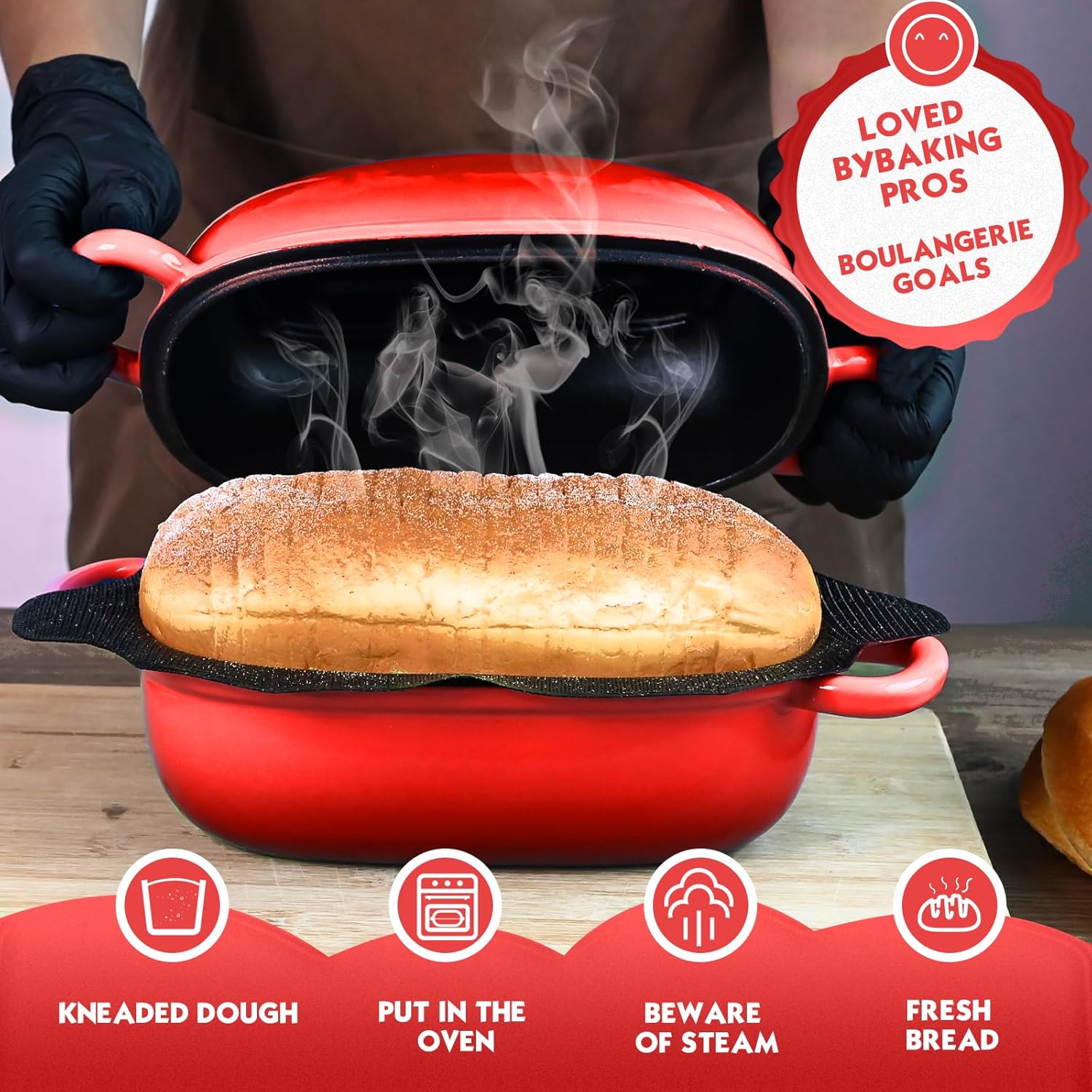 - [Safer Bread Baking] The handles of the cast iron bread oven are large enough to be operated with oven gloves, without worrying about burning your hands when the bread is degassing, effectively avoiding cumbersome or potentially dangerous operations during baking. The oval design keeps the bread moist inside, which helps to form the internal structure of the bread and perfectly bake the surface
