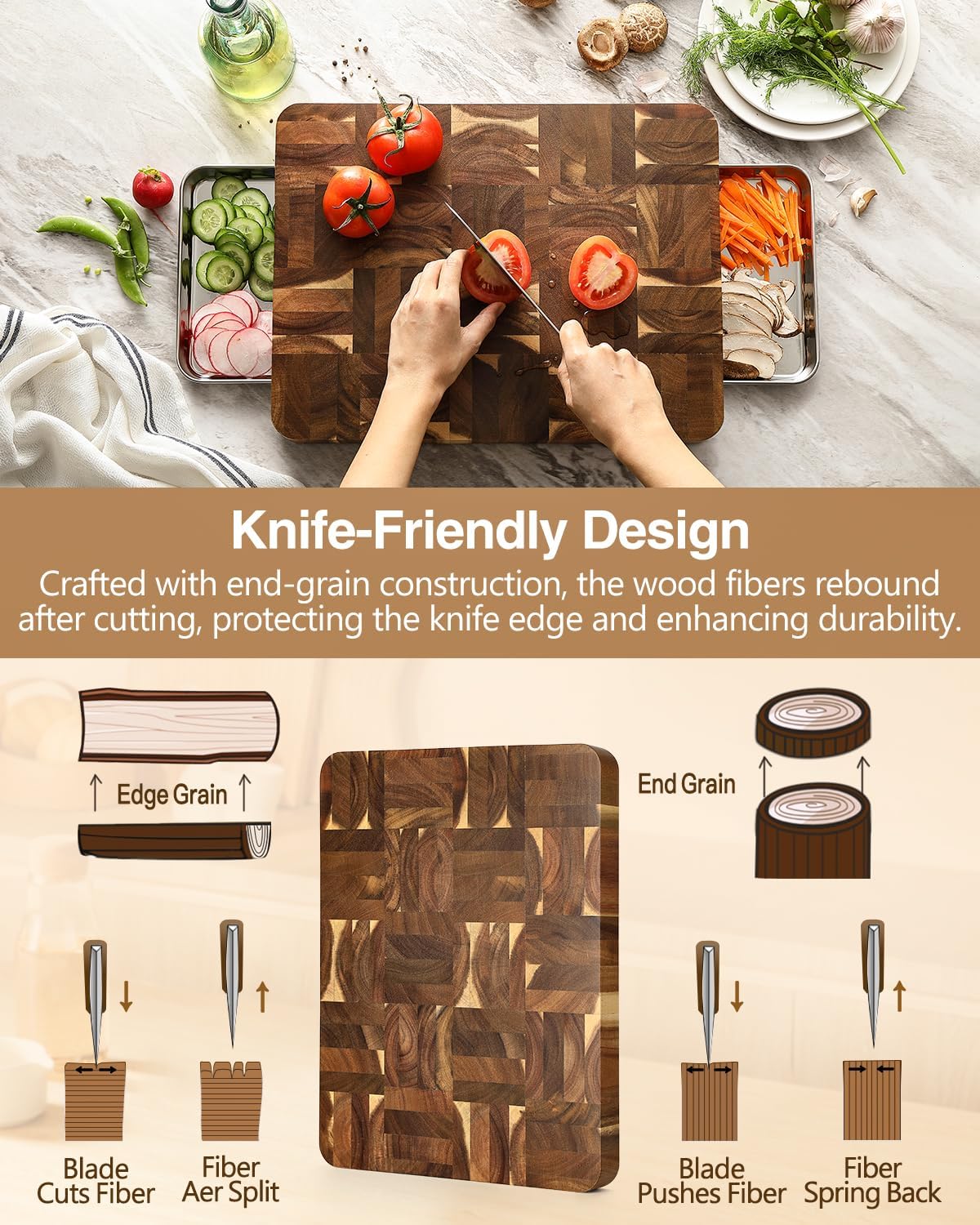 - 【More Friendly To Knife】Many people have a big misconception about wood end grain cutting boards; In fact, wood end grain cutting boards are better conversely; Our wood end grain are made from a dense core with consistent properties and are spliced with vertical grain on the end; When you use the cutting board,each knife cut goes between the wood fibers, rather than cutting through them; These fibers close back up after the knife exits, keeping your knife's edge sharper for longer