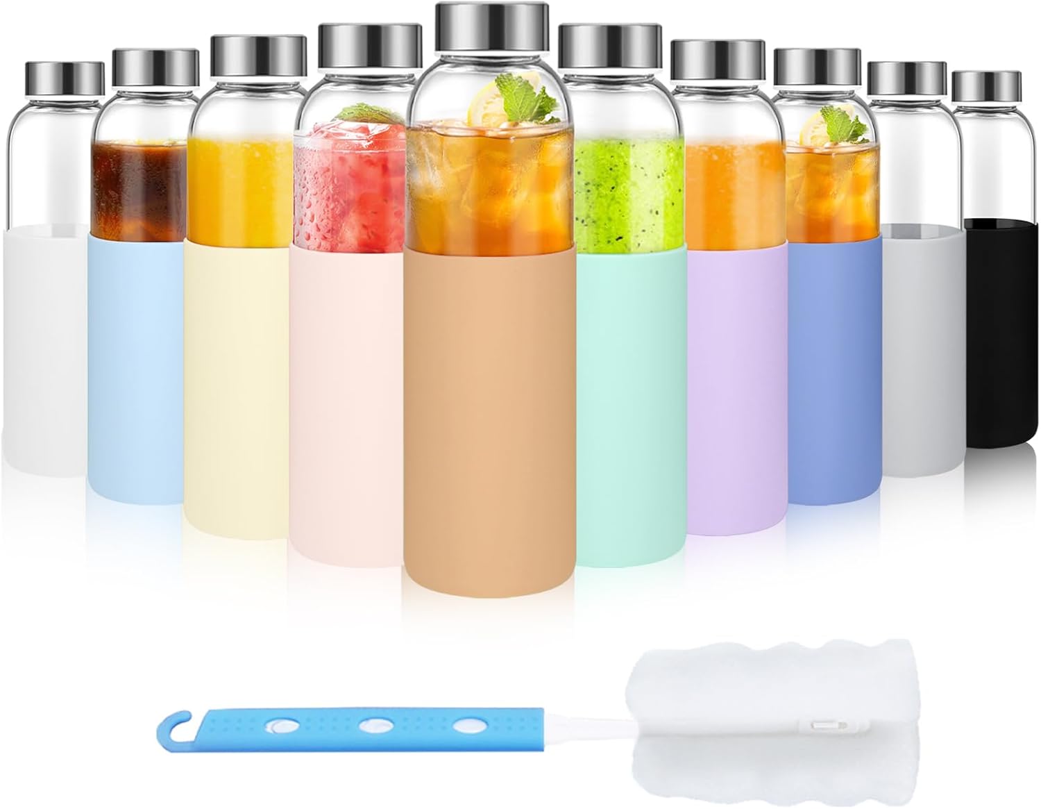 18 oz Glass Bottles with Lids and Silicone Sleeve, Reusable Glass Juice Bottles with Stainless Steel Cap for Juicing, Refrigerator,100% Leak Proof, BPA Free,Glass Water Bottles Set of 10