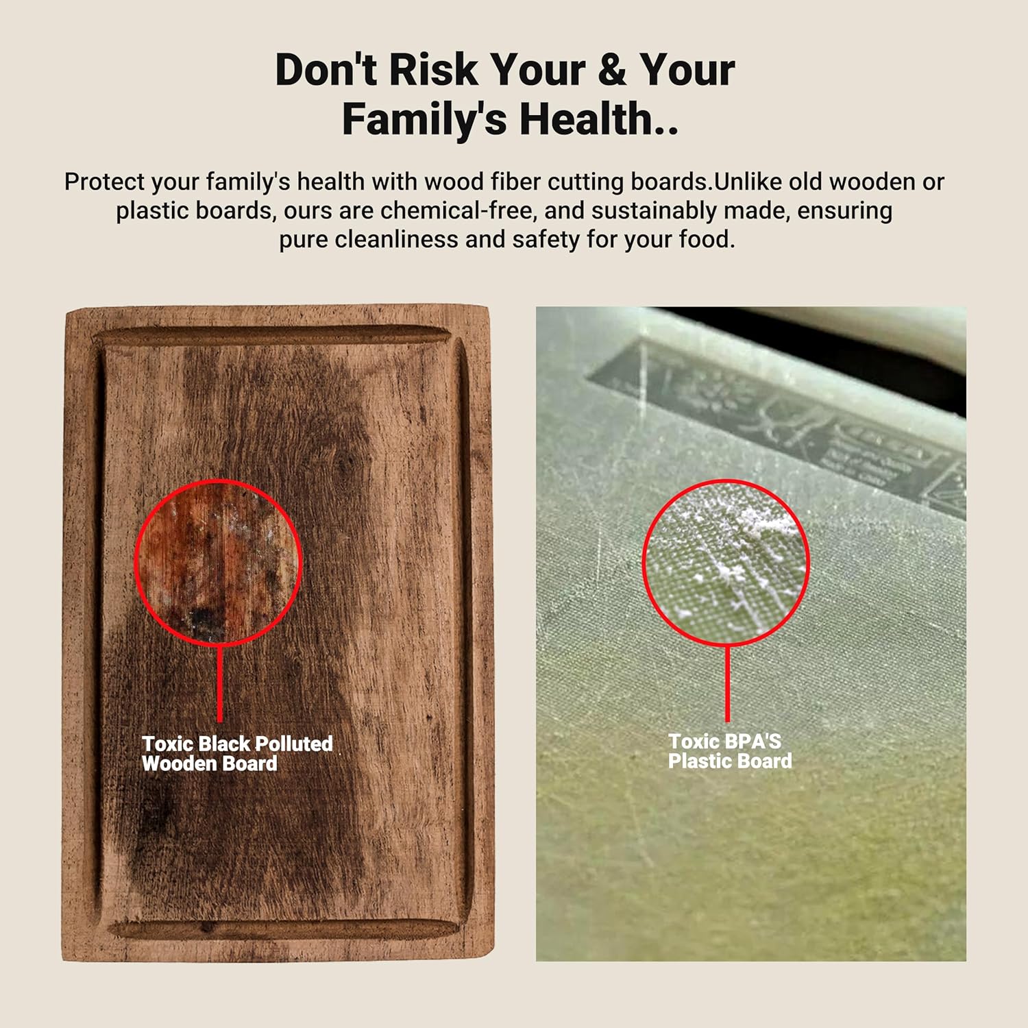 - Knife-Friendly & Heat Resistant - The eco-friendly wood fiber surface is gentle on your knives, resisting deep cut marks and helping to maintain their sharpness. With heat resistance up to 350°F, this board doubles as a trivet, offering versatile use without leaving marks.