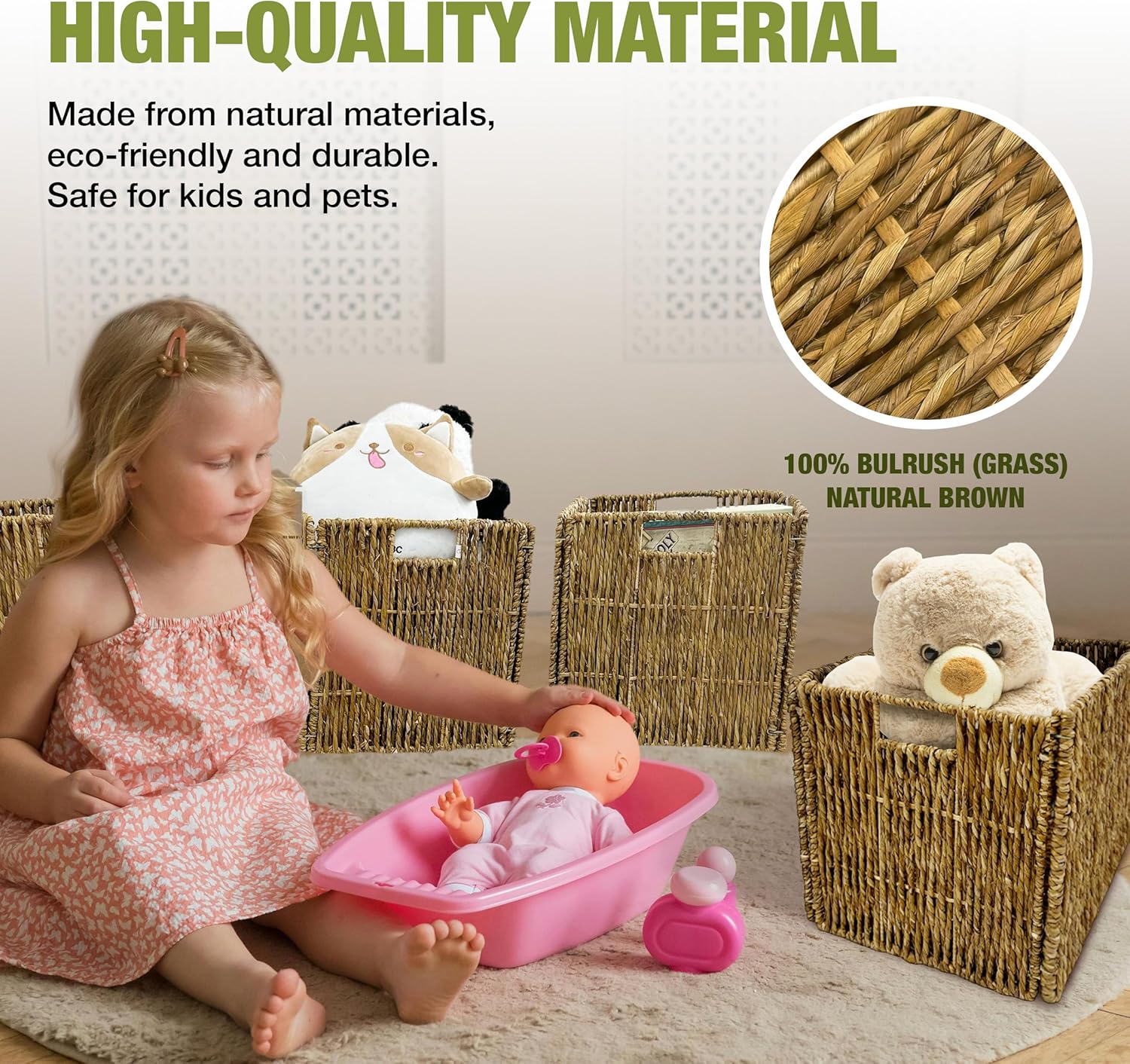 - Strong Woven Build - Handwoven bulrush and a reinforced metal frame keep the bins sturdy. No sagging, even when full.
