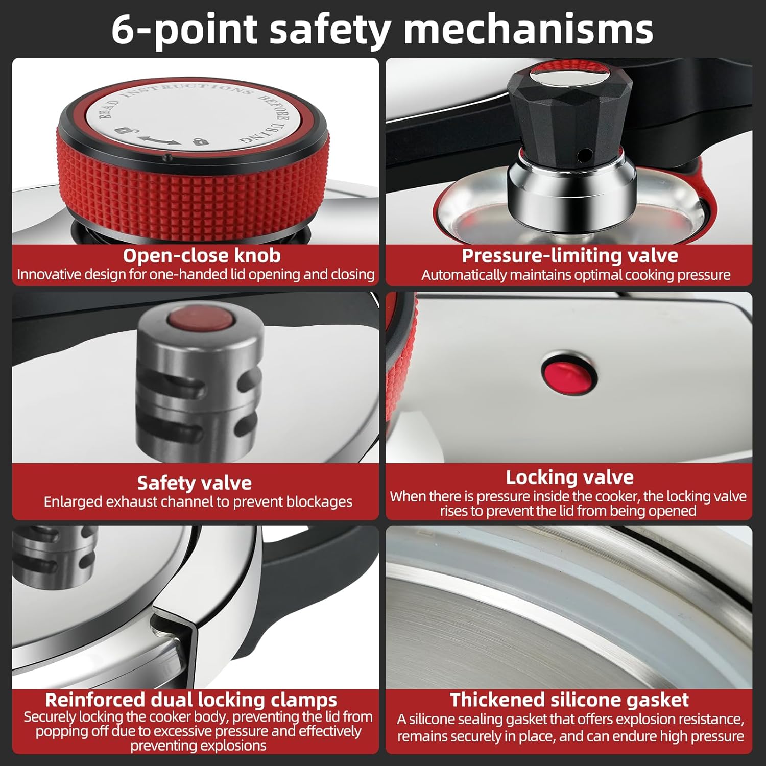 - ā [Ultra-safe construction]-Our 6-quart pressure cooker is filled with safety-enhancing features, such as an easy-to-lock lid, pressure-limiting valve, safety valve, locking valve, and reinforced dual locking clamps to ensure risk-free cooking.