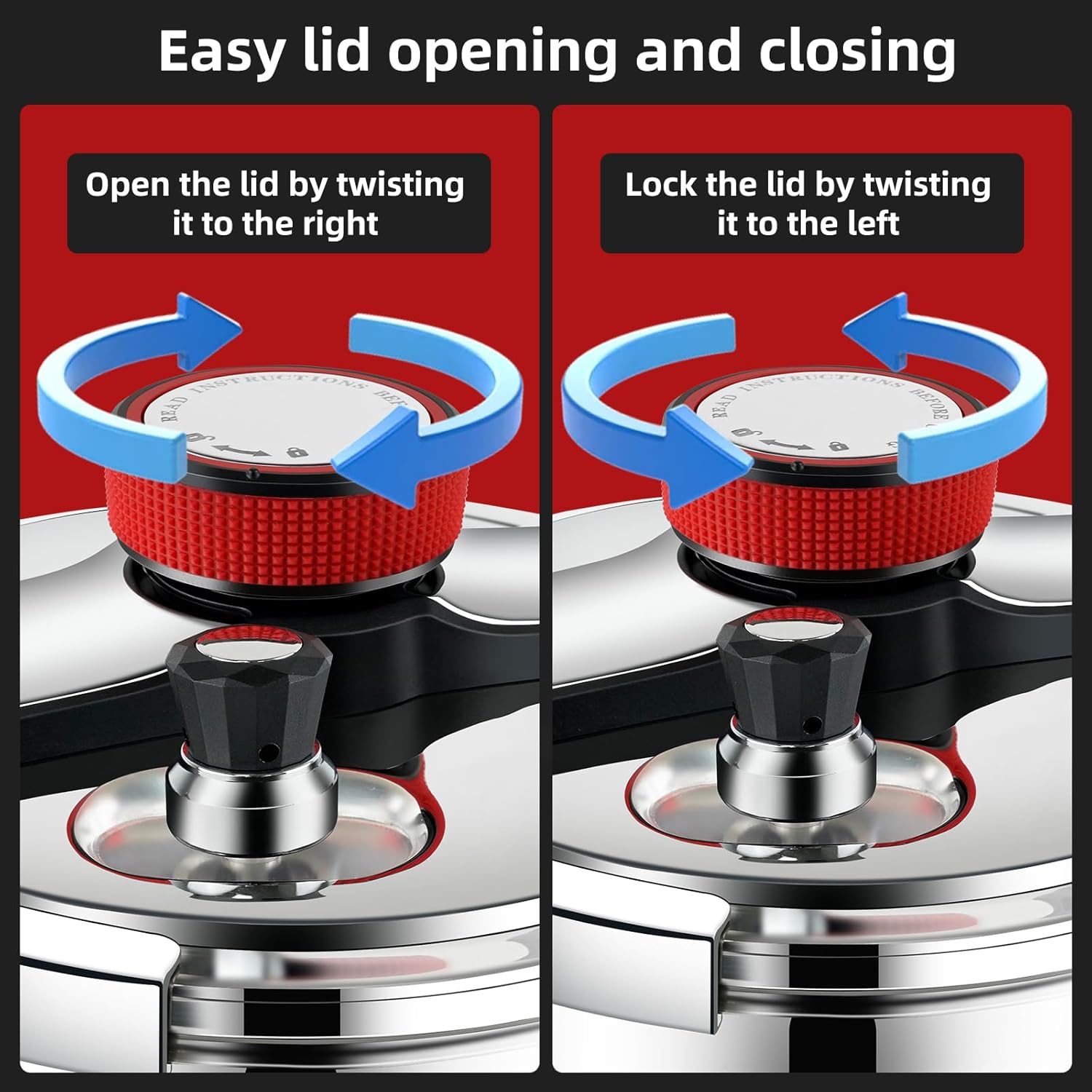 - ā [Unique easy-to-lock lid system]-This pressure cooker uses an innovative design for one-handed lid opening and closing, and the lid can be locked or opened in any position by turning the knob with one hand. If the pressure inside the pot increases, the lid cannot be unlocked.