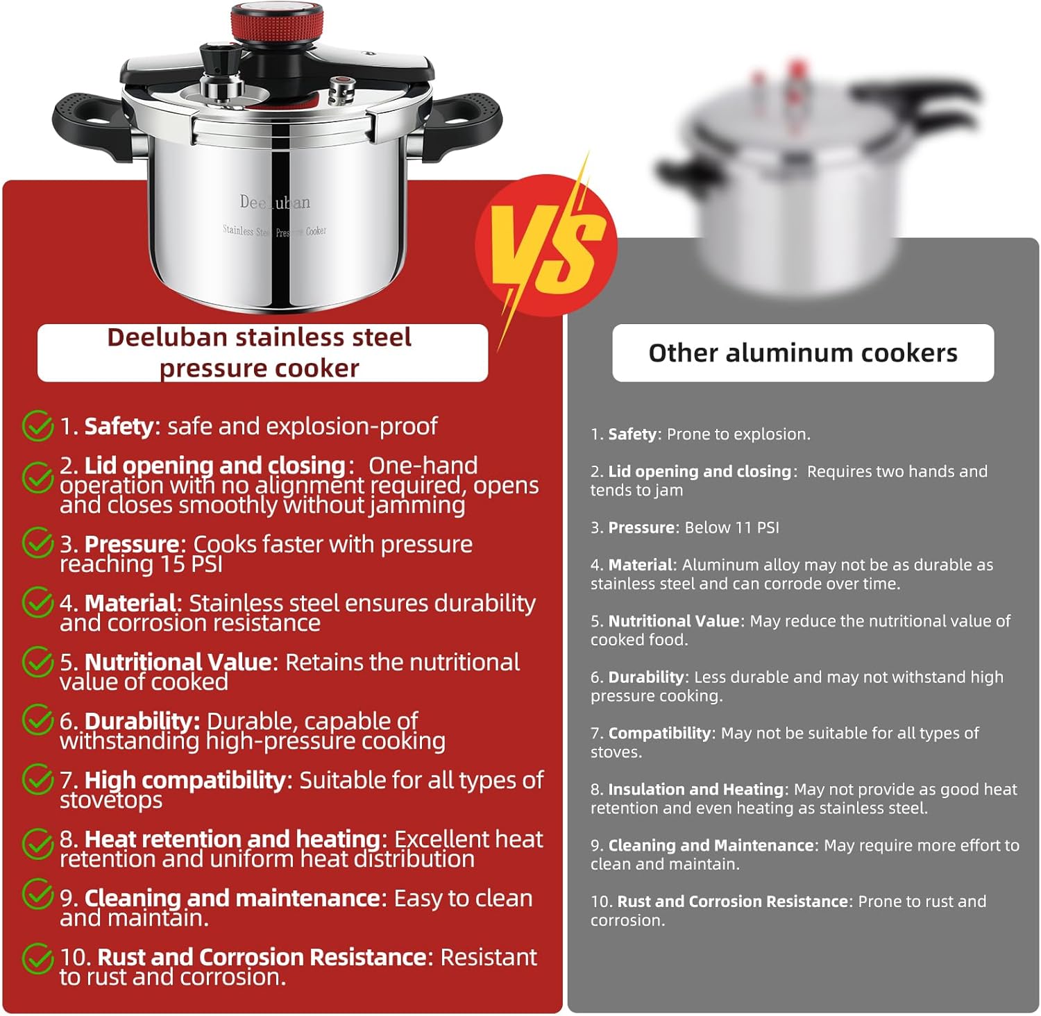 - ā [High pressure and fast cooking]-Compared with traditional cookers, the Deeluban pressure cooker reduces cooking time by at least 70%, speeds up cooking with 15 PSI pressure, and helps preserve the precious nutrition and flavor of food. For example, it can tenderize beef tendons in 15 minutes and cook a whole chicken in just 10 minutes.