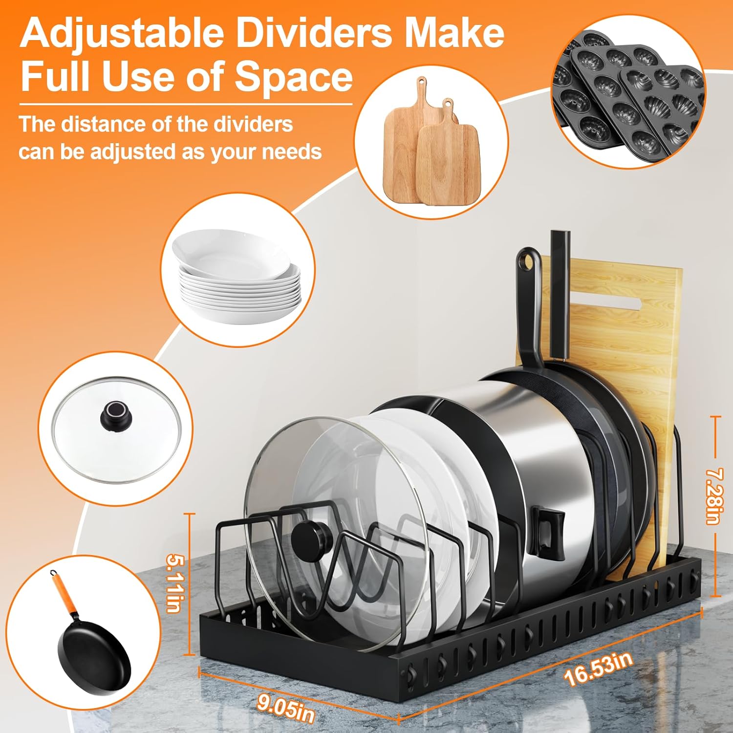 - 【Adjustable Shelf Design】The lid organizers inside the cabinet have two types of adjustable shelves that can be customized according to the shape of the kitchen utensils to meet your various needs