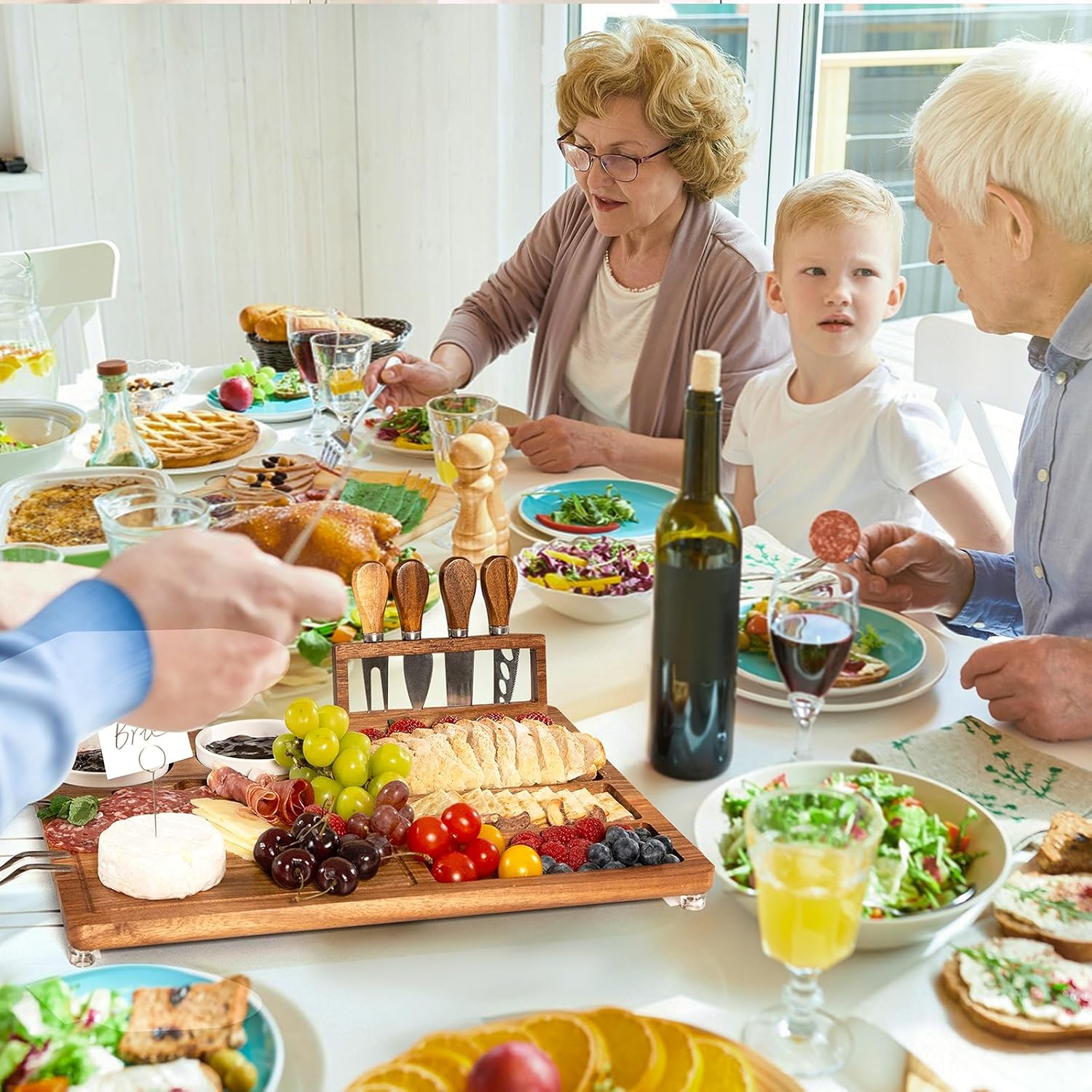 - STORAGE SOLUTION: Wooden serving board for party with Integrated foldable knife holder keeps tools organized and easily accessible while adding to the aesthetic appeal, and easy for cleaning and storage. Unique wedding gifts