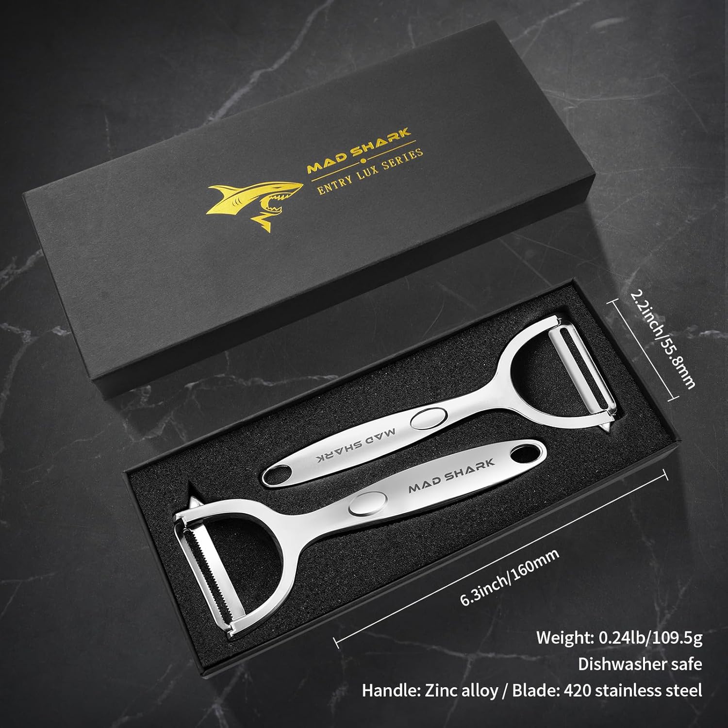 - EXCELLENT PACKAGING: Mad Shark potato peeler comes with a beautiful box instead of a simple and breakable plastic bag. You can also give it as a gift to your friends, your friends will also like this gift. If you encounter any problems, please contact with us with anytime