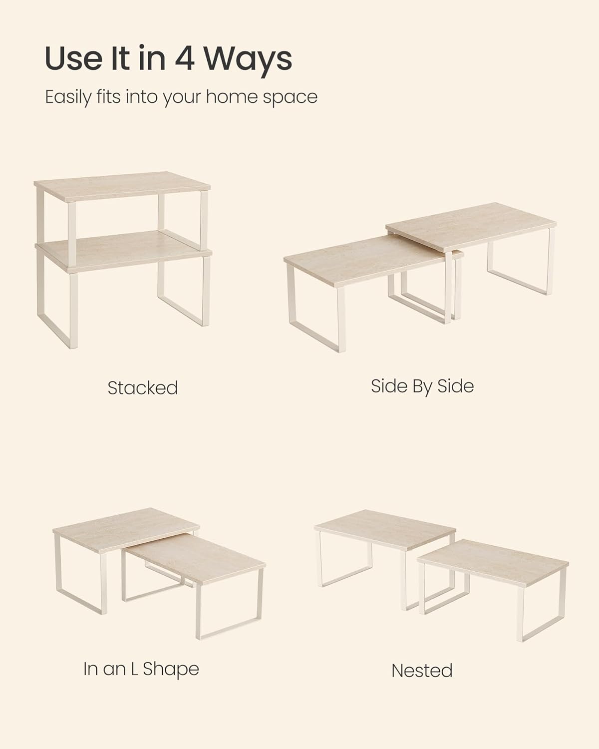 - [Adjustable] With their unique design, with one slightly smaller than the other, these shelf organizers can be stacked on top of one another, nested, used separately, or even in an L-shape. Adjust them how you want to perfectly fit your kitchen space
