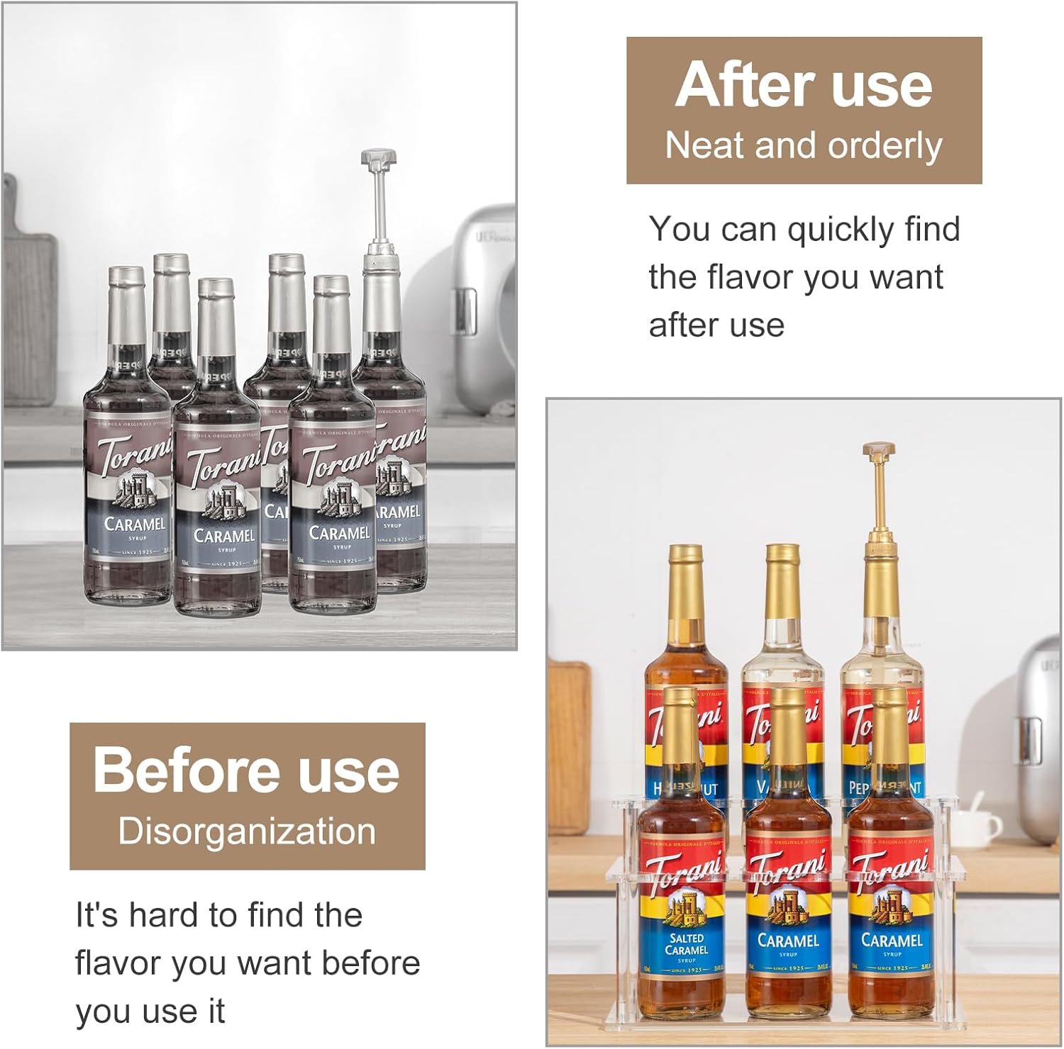 - Sturdy & Easy Access: This small syrup rack is made of high quality clear acrylic, strong and stable material that ensures the longevity of the syrup bottle holder. Location circle features can hold the syrup bottles securely and prevent them from falling or breaking. Even when fully loaded, the 2-tier syrup rack can be effortlessly lifted and moved to another position. Simply press the syrup pump on the rack for easy access.