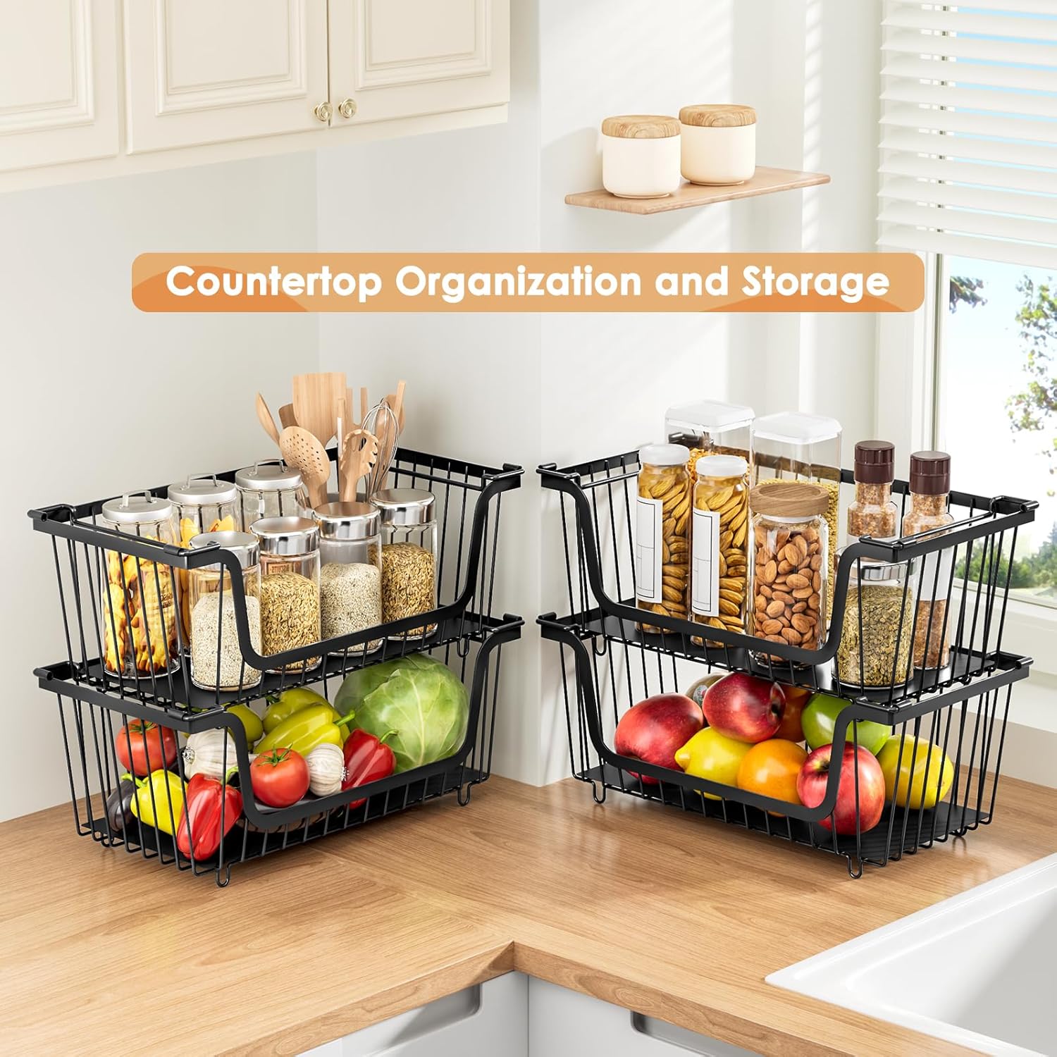 4 Pcs Stackable Wire Baskets for Pantry Organizers and Storage,Kitchen Storage Metal Baskets,Produce Potato Onion Storage Bin,Vegetable Fruit Basket for Countertop,Black