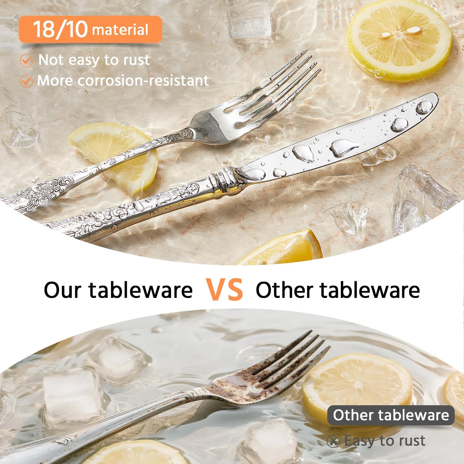 KINGSTONE Vintage Carved Silverware Set, 60-Piece 18/10 Stainless Steel Flatware Cutlery Set with Retro Royal Thick Handle, Tableware Utensils for Home, Restaurant, party, Wedding, Dishwasher Safe